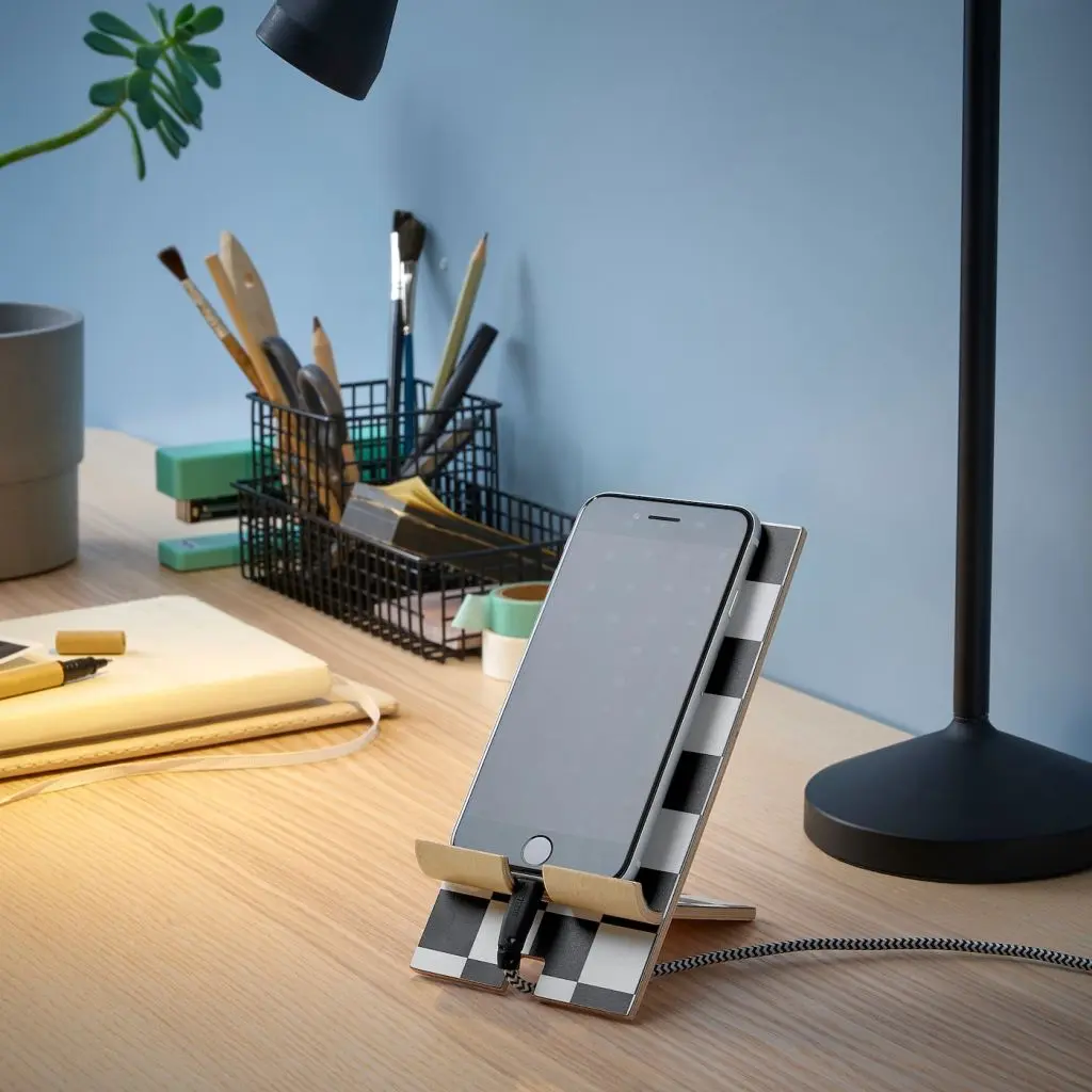 PLUGGLAND ПЛУГГЛАНД Подставка д/мобильного телефона, клетчатый орнамент/черный белый, 8x10x15 см