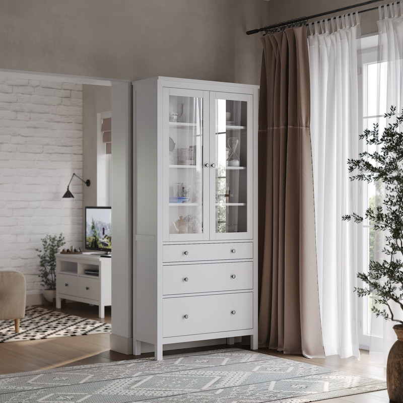 Шкаф для посуды 23 Кантри двухдверный, 900х370х1970, цвет Белый. Двухдверный шкаф с тремя полками за остеклёнными дверями и тремя выдвижными ящиками перменной высоты для различных столовых предметов. Шкаф «Кантри» предназначен для тех, кто любит простоту и минимализм. Шкаф понравится всем поклонникам скандинавского стиля. Изготовлен из массива хвойных пород. Крепится к стене. Мебель для жилых помещений. Гарантийный срок 24 месяца.