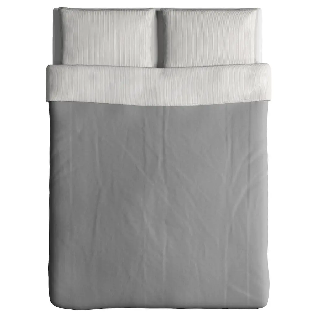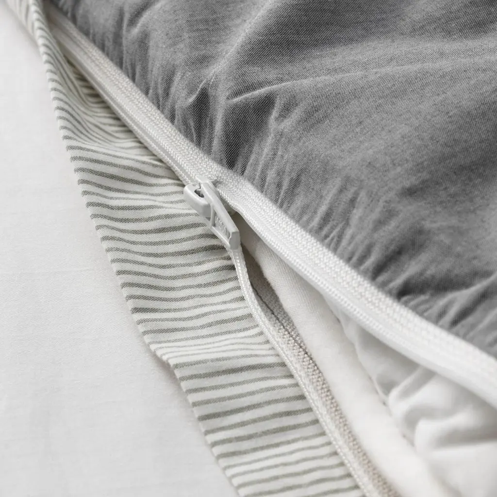 Прохладное свежее постельное белье из мягкого плотного хлопка. С одной стороны ткань шамбре, с другой — орнамент в полоску. Благодаря молнии одеяло не будет выбиваться.