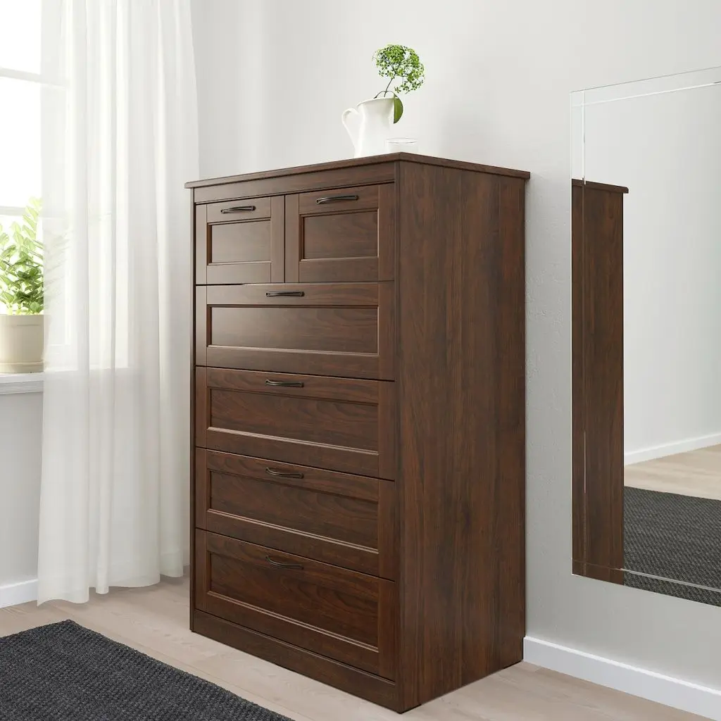 Ваш дом должен быть абсолютно безопасен для всей семьи. Именно поэтому крепеж безопасности для фиксации комода к стене прилагается.Чтобы ящики не выпадали при открывании, они оснащены специальным стопором.ВНИМАНИЕ! ОПАСНОСТЬ ОПРОКИДЫВАНИЯ! Незакрепленная мебель может опрокинуться. Эту мебель необходимо крепить к стене с помощью прилагаемого крепежа для предотвращения опрокидывания.Для различных материалов стен требуются различные крепежные средства. Используйте крепежные средства, подходящие для материала стен в вашем доме.В маленький ящик можно положить примерно 5 пар брюк или 10 футболок.Большой ящик вмещает около 15 пар брюк или 30 футболок в сложенном виде.Дизайнер