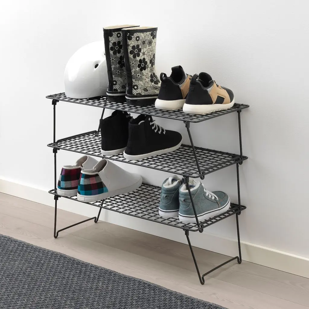 Можно поставить в прихожей для повседневной обуви или в гардероб для сезонного хранения. Полка легко раскладывается, поэтому вы можете поставить дополнительную полку, когда приходят гости.Полка вмещает 3 пары обуви. Три полки можно поставить одну на другую.Дизайнер