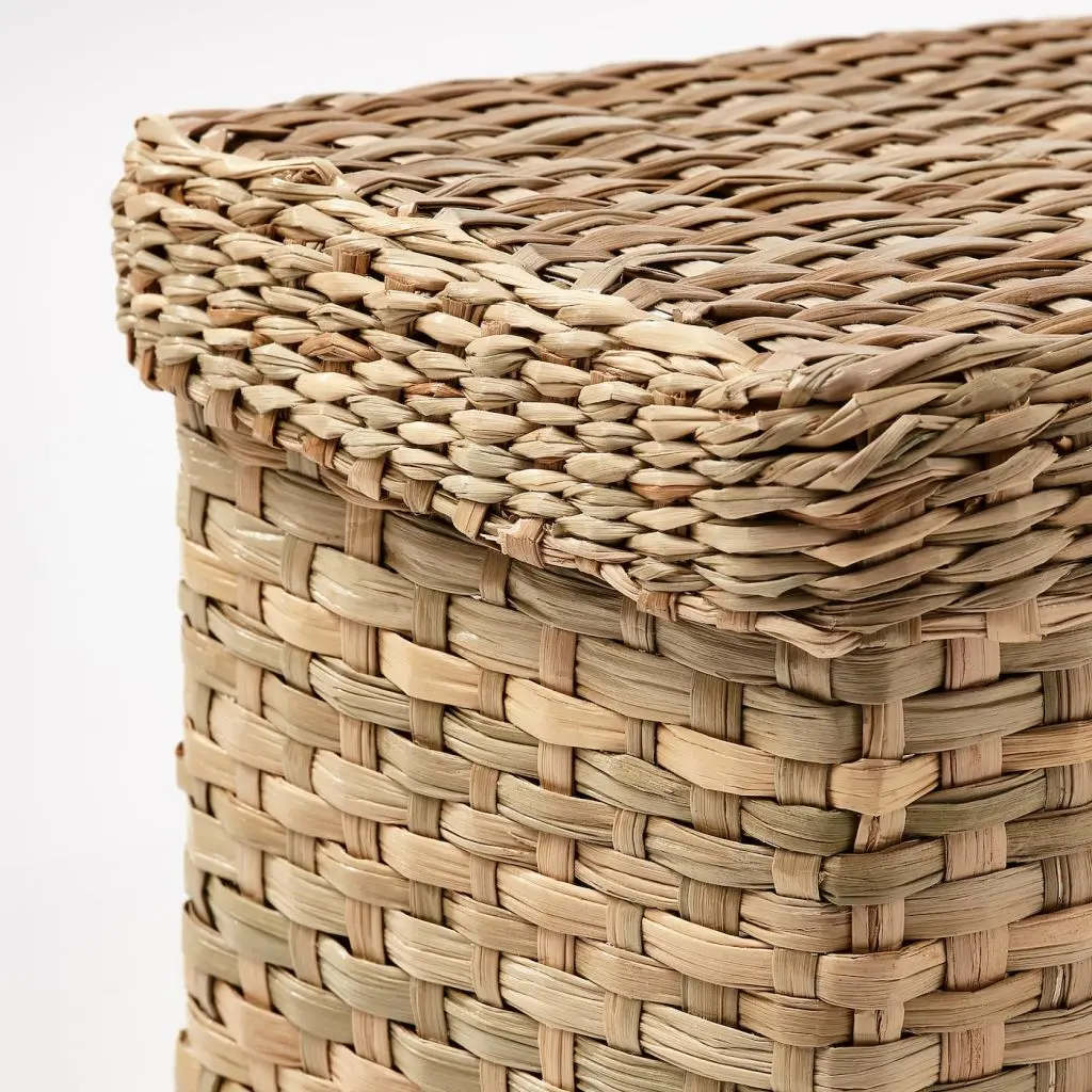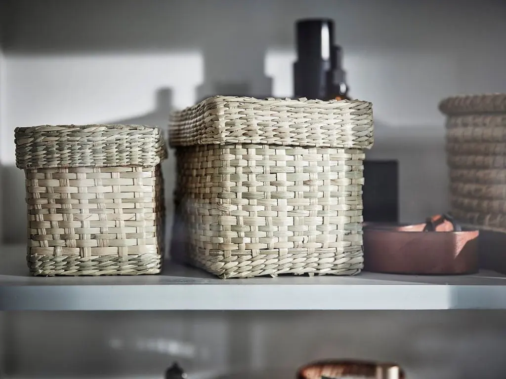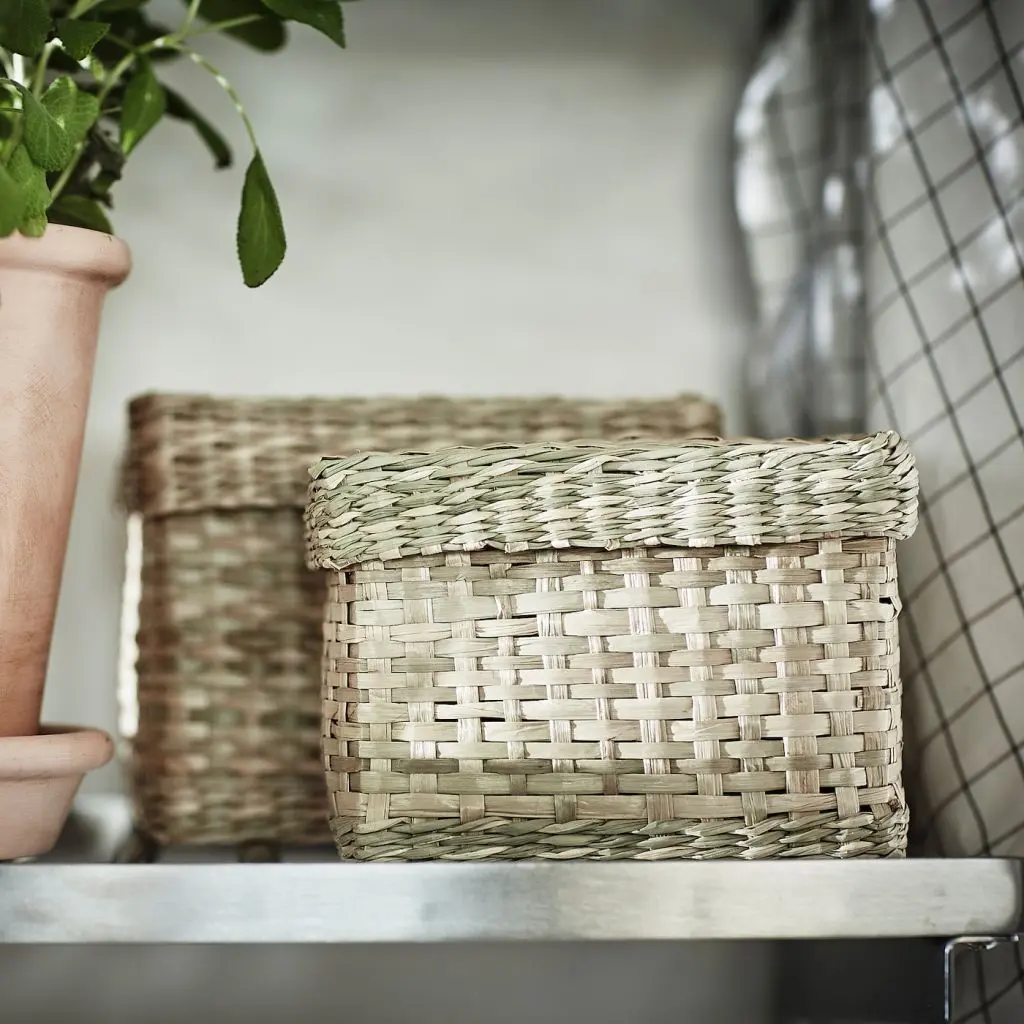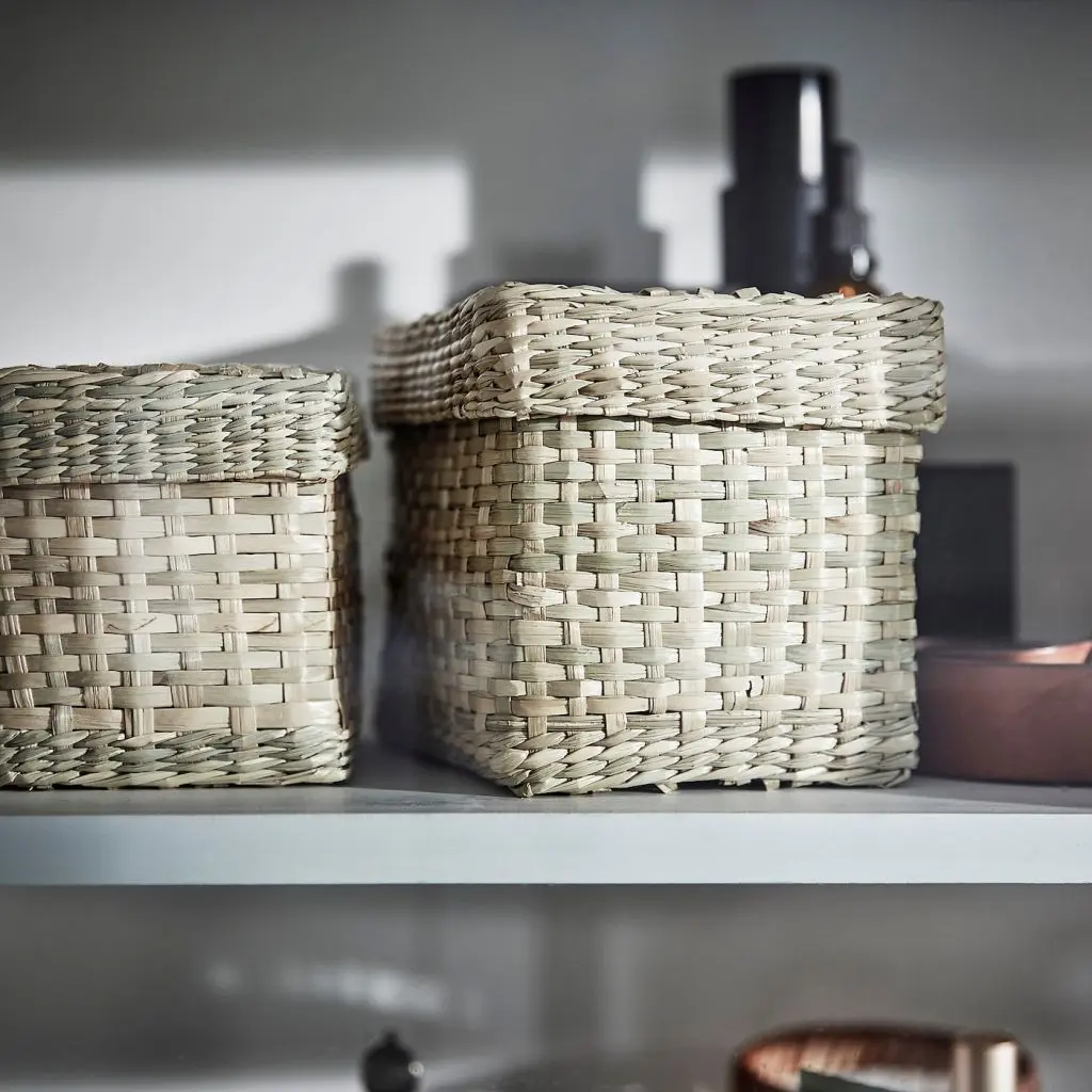 Идеальное решение для хранения различных мелочей: от канцелярских принадлежностей до косметики и заколок для волос.Морские водоросли — это природный материал с естественными вариациями цвета, оттенок которого зависит от региона, где росло растение, а также временем сбора урожая и преобладающими погодными условиями.Изготовлено вручную искусными мастерами, поэтому дизайн и размеры изделий отличаются.2 коробки с крышками (15,5×10,5×11 см и 17,5×12,5×12 см).Дизайнер