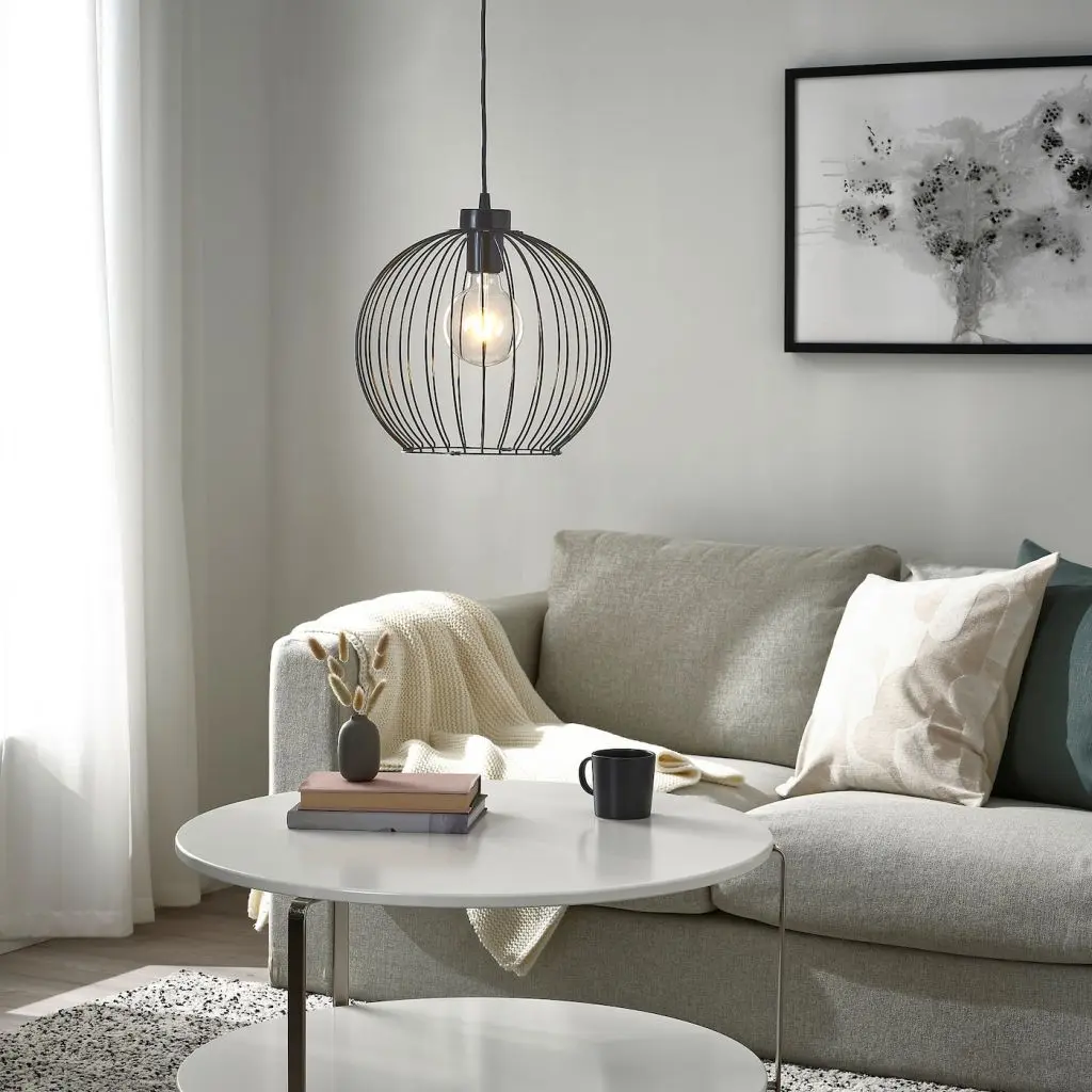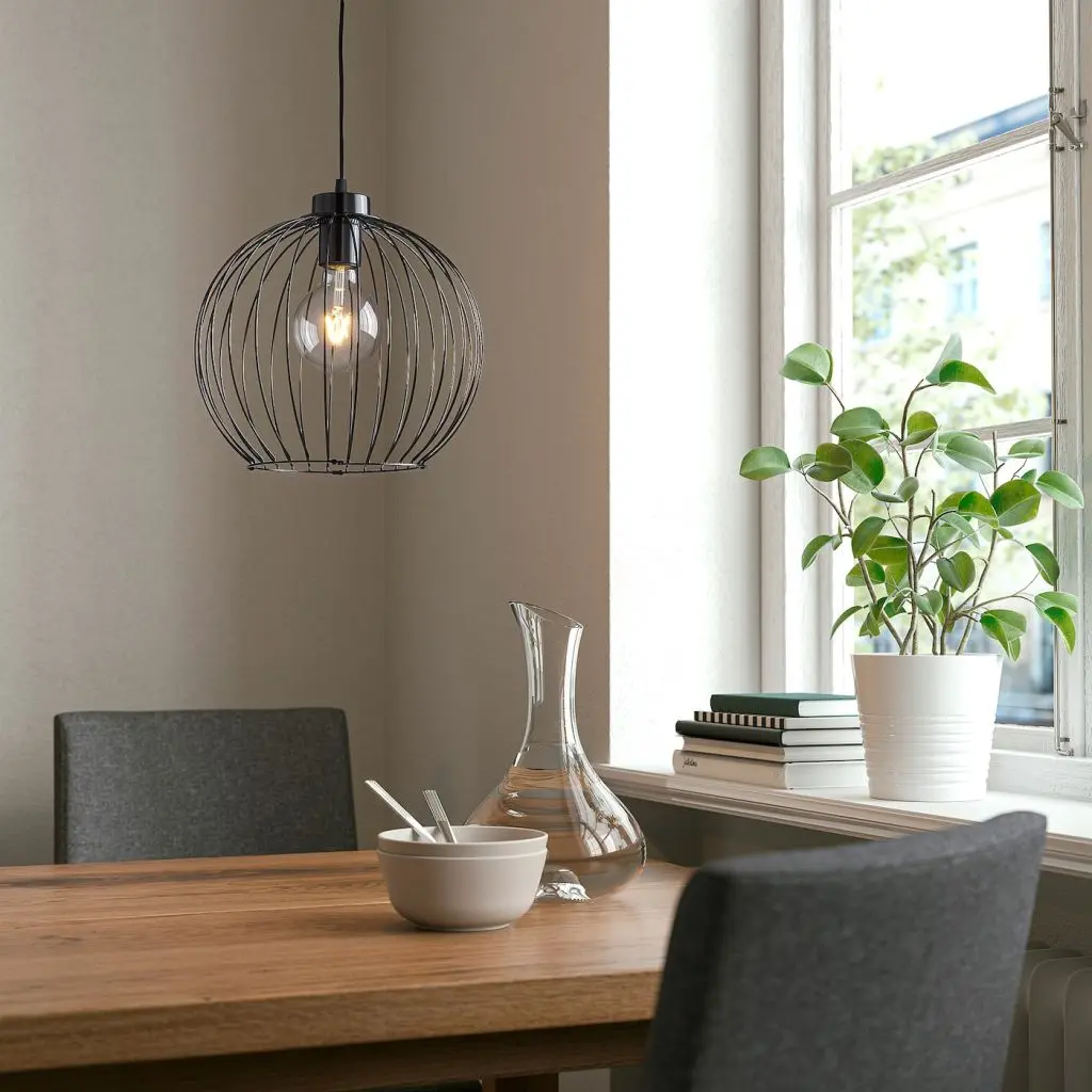 Вертикальные линии на круглом абажуре создают в комнате живую игру света и тени. Чтобы завершить создание подвесного светильника, дополните его декоративной лампочкой.