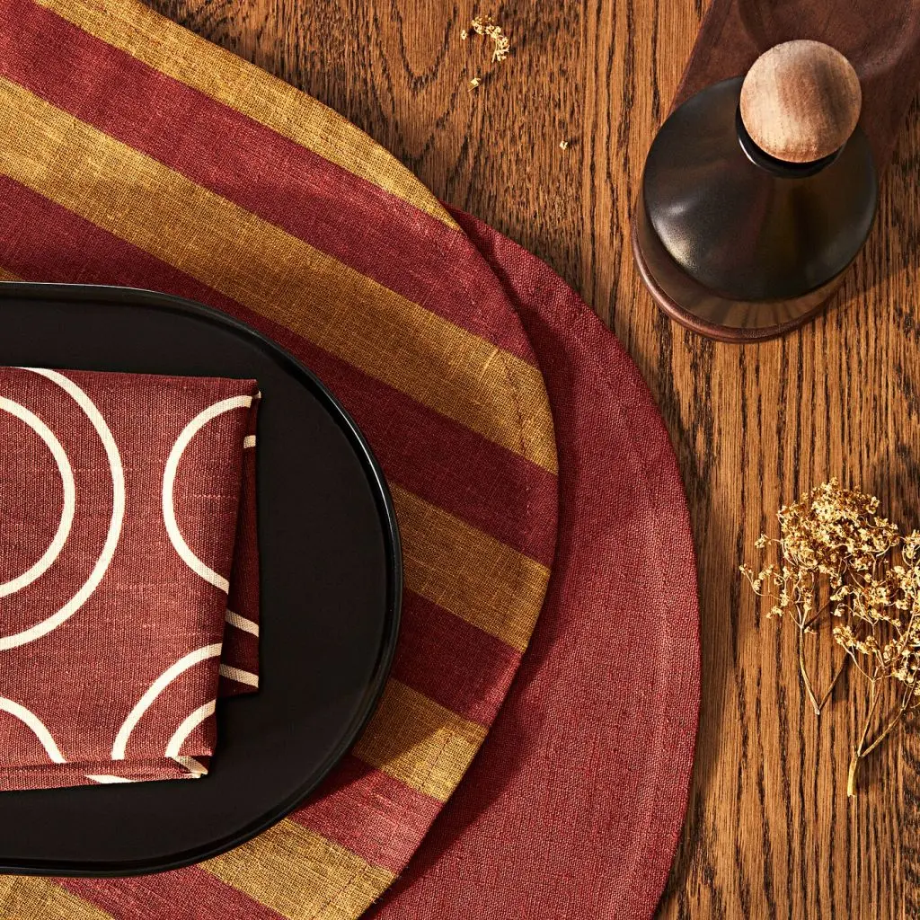 Украсьте обеденный стол льняными и хлопковыми салфетками под приборы. Полосатый узор в осенних тонах помогает создать уютную, располагающую обстановку, а сами салфетки защищают поверхность стола.