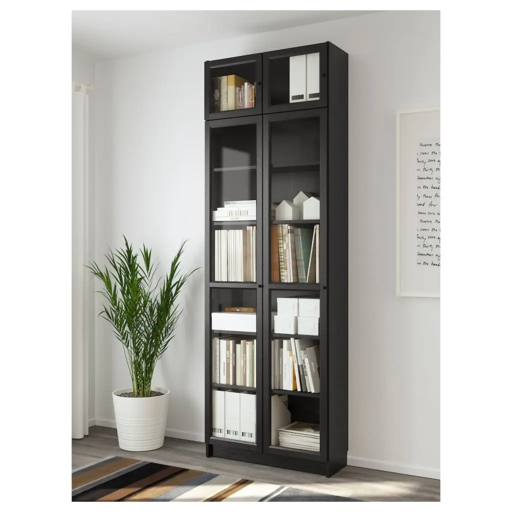 Стеллаж снабжен дополнительной верхней полкой: вы можете максимально задействовать поверхность стены.Съемные полки; устанавливайте на разном уровне в соответствии с необходимостью.Отделка из шпона. Конструкция петель позволяет отрегулировать и выровнять дверцу по вертикали и по горизонтали. Стеклянные дверцы защищают любимые вещи от пыли.Для разных стен требуются различные крепежные приспособления. Подберите подходящие для ваших стен шурупы, дюбели, саморезы и т. п. (не прилагаются).Эту мебель необходимо крепить к стене с помощью прилагаемого стенного крепежа.Дизайнер