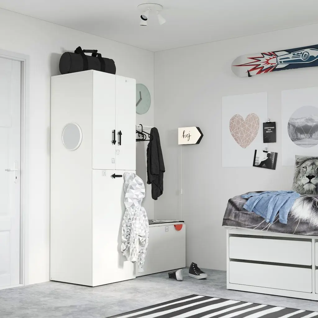 Для безопасности как детей, так и взрослых все дверцы системы СМОСТАД имеют скругленные углы.Благодаря крючкам изнутри и снаружи ребенку будет гораздо проще развешивать одежду, рюкзаки и другие вещи, которые обычно просто валяются на полу.В нижней части выдвижного модуля можно хранить все, что нужно быстро убирать с глаз долой.Двери, петли и платяная штанга прилагаются.2 крючка для платяной штанги ХЭЛПА и 4 крючка/зажима ЛЭТТХЕТ прилагаются.ВНИМАНИЕ! ОПАСНОСТЬ ОПРОКИДЫВАНИЯ! Незакрепленная мебель может опрокинуться. Эту мебель необходимо крепить к стене с помощью прилагаемого крепежа для предотвращения опрокидывания.Для сборки этой мебели требуются два человека.Для разных стен требуются различные стенные крепления. Прилагающиеся шурупы пригодны для дерева, а дюбели можно использовать для гипсокартона/штукатурки, бетона или кирпичной кладки. Руководствуйтесь инструкциями по работе с материалом ваших стен.Для организации внутреннего простраства дополните аксессуарами ХЭНГИГ, полками и пролочными корзинами ХЭЛПА и коробками УППРЮМД. Продаются отдельно.Ручки продаются отдельно.