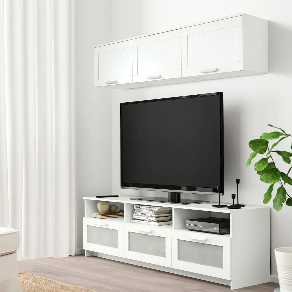 Глухие дверцы защитят содержимое от пыли.Отверстия для проводов на задней панели. Провода не на виду, но всегда под рукой.Ящики с плавным ходом и стопором.Эту мебель необходимо крепить к стене с помощью прилагаемого стенного крепежа.Будьте осторожны при обращении со стеклом! Из-за поврежденных краев и царапин на поверхности стекло может внезапно треснуть и/или разбиться. Избегайте ударов сбоку, там стекло наиболее уязвимо.Для разных стен требуются различные крепежные приспособления. Подберите подходящие для ваших стен шурупы, дюбели, саморезы и т. п. (не прилагаются).Комбинируется с другой мебелью серии БРИМНЭС.Дизайнер