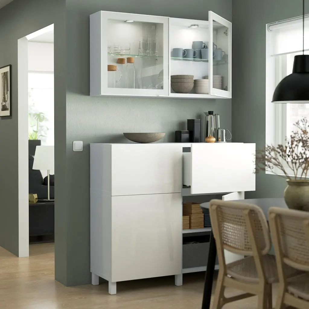 Стеклянные дверцы позволяют продемонстрировать содержимое шкафа, защищая его от пыли.Благодаря доводчикам ящики закрываются плавно и бесшумно.Конструкция петель позволяет отрегулировать и выровнять дверцу по вертикали и по горизонтали. Съемные полки позволяют регулировать пространство.Компактные навесные шкафы позволяют эффективно задействовать стену под хранение вещей.Два ящика и полки за дверцами обеспечат достаточно места для хранения.Организуйте и оптимизируйте систему для хранения БЕСТО, используя подходящие коробки и вставки.Эту мебель необходимо крепить к стене с помощью прилагаемого стенного крепежа.Будьте осторожны при обращении с закаленным стеклом! Из-за поврежденных краев и царапин на поверхности стекло может внезапно разбиться.Для разных стен требуются различные крепежные приспособления. Подберите подходящие для ваших стен шурупы, дюбели, саморезы и т. п. (не прилагаются).Если вы выберете функцию плавного закрывания, рекомендуем дополнить фасады ручками, чтобы открывать ящики/шкафы было удобнее.Ручки продаются отдельно.Чтобы создать единый интерьер во всем доме, фасады СЕЛЬСВИКЕН можно комбинировать с подходящими дверями ФАРДАЛЬ для гардероба ПАКС.