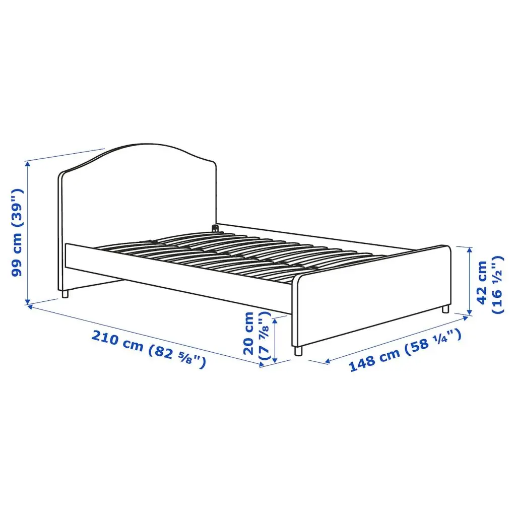 В комплект входит: 1 каркас кровати с обивкой с реечным дном и центральной перекладиной и 1 прикроватная тумба.