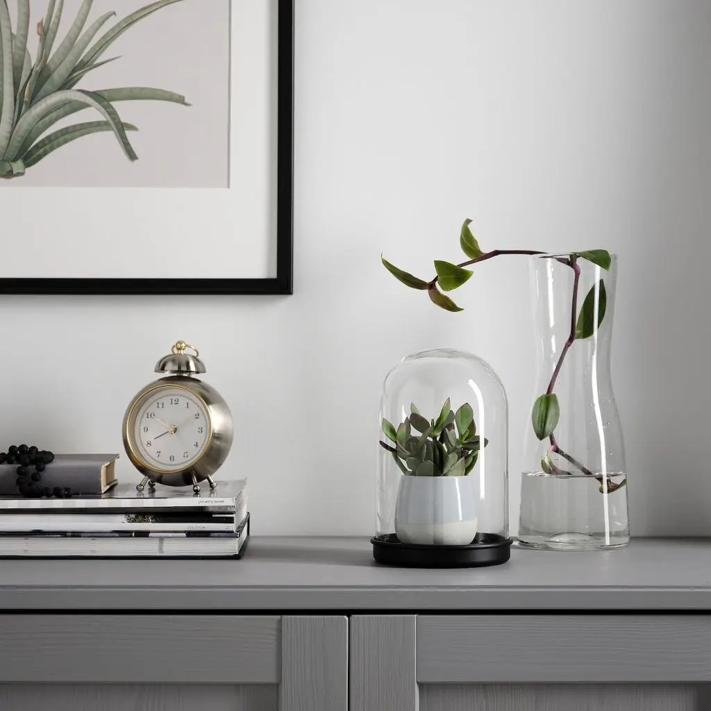 Стеклянный клош на подставке можно использовать для демонстрации ваших любимых декоративных предметов.Дизайнер