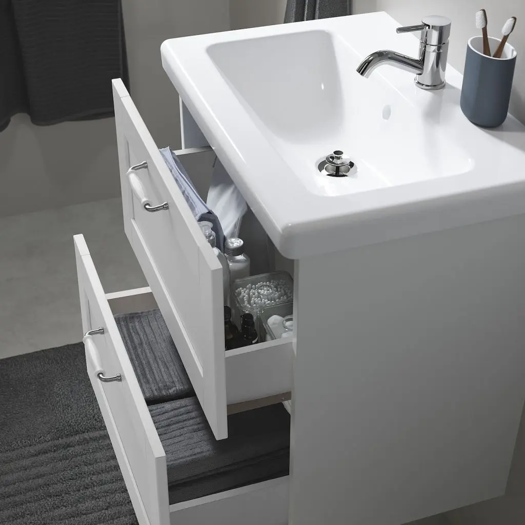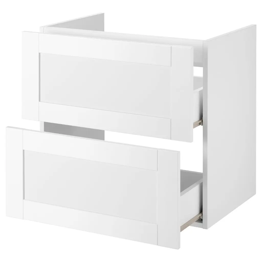 Достаточно места для хранения и идеальное решение для небольших ванных комнат, так как ширина шкафа всего 60 см.Вещи, которые используются часто — ватные диски, щетки и средства гигиены, удобно хранить в верхнем ящике, а для полотенец используйте нижний ящик.Можно дополнить ножками ФИСКОН, продаются отдельно.Дополните раковиной ТВЭЛЛЕН.
