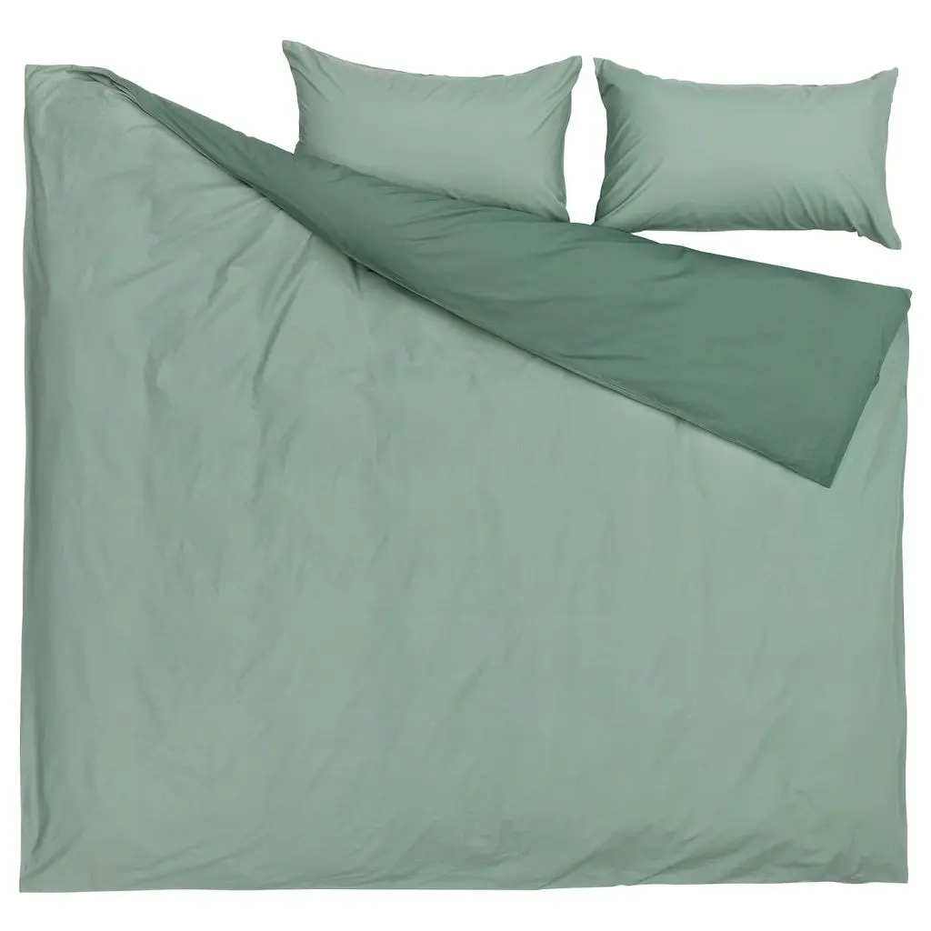 Пододеяльник зеленый с одной стороны и темно-зеленый — с другой. Плотная перкаль с приятным легким блеском из смеси хлопка и вискозы превосходно пропускает воздух и впитывает влагу, обеспечивая комфортный сон.
