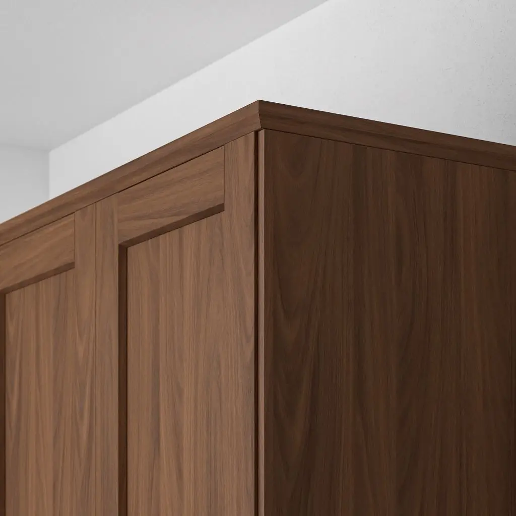 Можно использовать как декоративный карниз под навесными шкафами, чтобы спрятать подсветку, провода и розетки, а также установить на верхний край навесных и высоких шкафов.