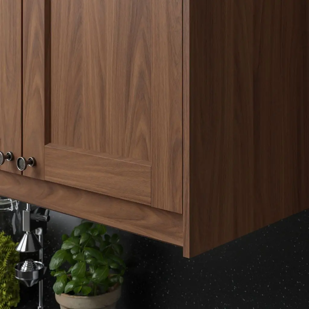 Классическая коричневая отделка под грецкий орех смотрится элегантно и выдержит испытание временем. Фасады ЭНЧЁПИНГ ламинированы прочной пленкой, имитирующей естественный рисунок древесины, что делает кухню особенно уютной.