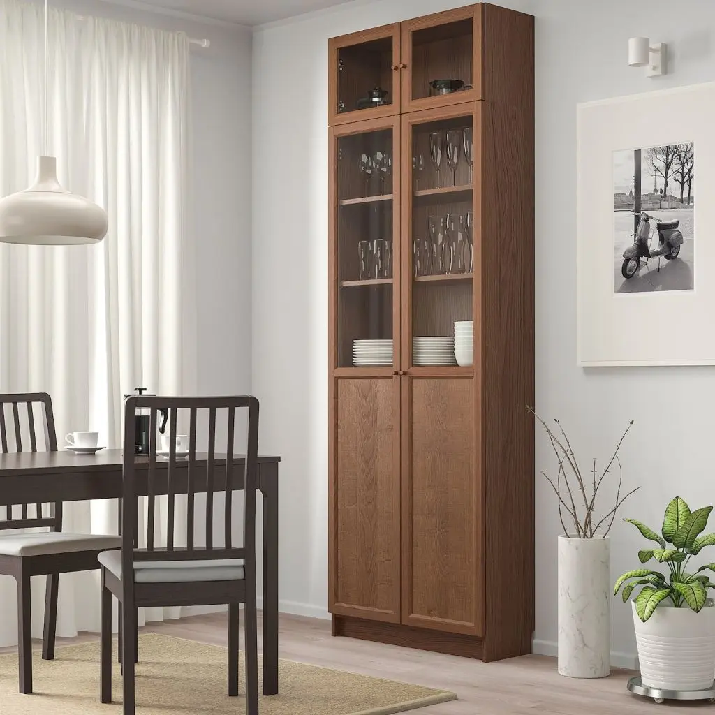 Стеллаж снабжен дополнительной верхней полкой: вы можете максимально задействовать поверхность стены.Дверцы со стеклянной вставкой обеспечивают защиту содержимого от пыли и позволяют Вам продемонстрировать вещи или спрятать их от посторонних глаз.Конструкция петель позволяет отрегулировать и выровнять дверцу по вертикали и по горизонтали. Съемные полки; устанавливайте на разном уровне в соответствии с необходимостью.Отделка из шпона. Эту мебель необходимо крепить к стене с помощью прилагаемого стенного крепежа.Будьте осторожны при обращении со стеклом! Из-за поврежденных краев и царапин на поверхности стекло может внезапно треснуть и/или разбиться. Избегайте ударов сбоку, там стекло наиболее уязвимо.Для разных стен требуются различные крепежные приспособления. Подберите подходящие для ваших стен шурупы, дюбели, саморезы и т. п. (не прилагаются).Требуемая мин. высота потолка: 205 см.Можно установить на угловой модуль, только если полка, находящаяся рядом с ним, без дверец.Дверь не подходит для стеллажей, которые были приобретены весной 2014 года или раньше.1 несъемная и 4 съемные полки прилагаются.Дизайнер