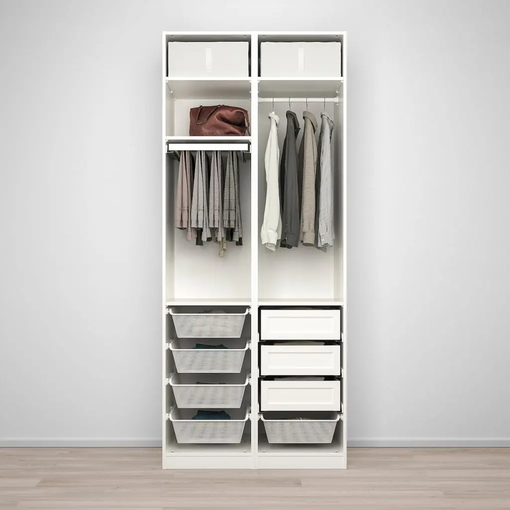 Бесплатно 10 лет гарантии. Подробнее об условиях гарантии – в гарантийной брошюре.Выдвижная вешалка для брюк обеспечивает хороший обзор и удобный доступ к вашим вещам.Регулируемые ножки позволяют скорректировать неровности пола.Благодаря петлям с интегрированным доводчиком дверцы закрываются плавно и бесшумно.С помощью программы планирования гардероба ПАКС вы можете легко дополнить свою комбинацию интегрированной подсветкой. После выбора источника освещения программа предложит необходимые аксессуары.Сетчатый материал обеспечивает циркуляцию воздуха. Корзина подходит для хранения сложенной одежды и различных аксессуаров.Эту комбинацию ПАКС/КОМПЛИМЕНТ можно адаптировать в соответствии с вашими потребностями, воспользовавшись программой для проектирования гардеробов ПАКС.Эту мебель необходимо крепить к стене с помощью прилагаемого стенного крепежа.Для разных стен требуются различные крепежные приспособления. Подберите подходящие для ваших стен шурупы, дюбели, саморезы и т. п. (не прилагаются).Для сборки этой мебели требуются два человека.Требуемая мин. высота потолка: 244 см. Следуйте инструкциям по сборке в упаковке.Аксессуары для организации хранения в гардеробе продаются отдельно.Ручки продаются отдельно.Для этого товара необходимы петли. Петли включены в стоимость, но продаются в отдельной упаковке.Дизайнер