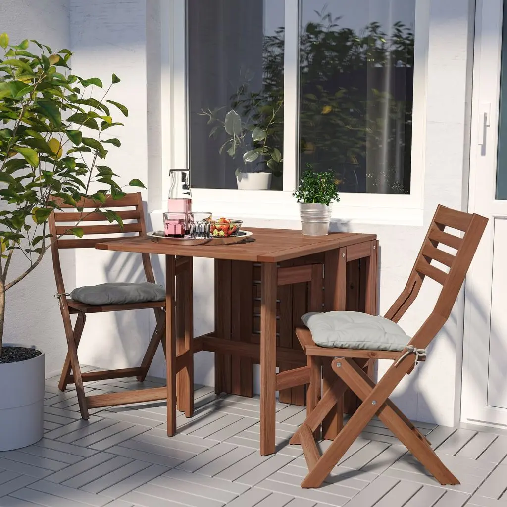 2 откидные столешницы позволяют регулировать размер стола по необходимости.Мебель обработана полупрозрачной морилкой в несколько слоев. Это повышает ее прочность и подчеркивает выразительность натуральной фактуры дерева.Чтобы продлить срок службы подушки, ее можно регулярно переворачивать.Эта мебель занимает мало места при хранении, так стол и стулья складываются.Дизайнер