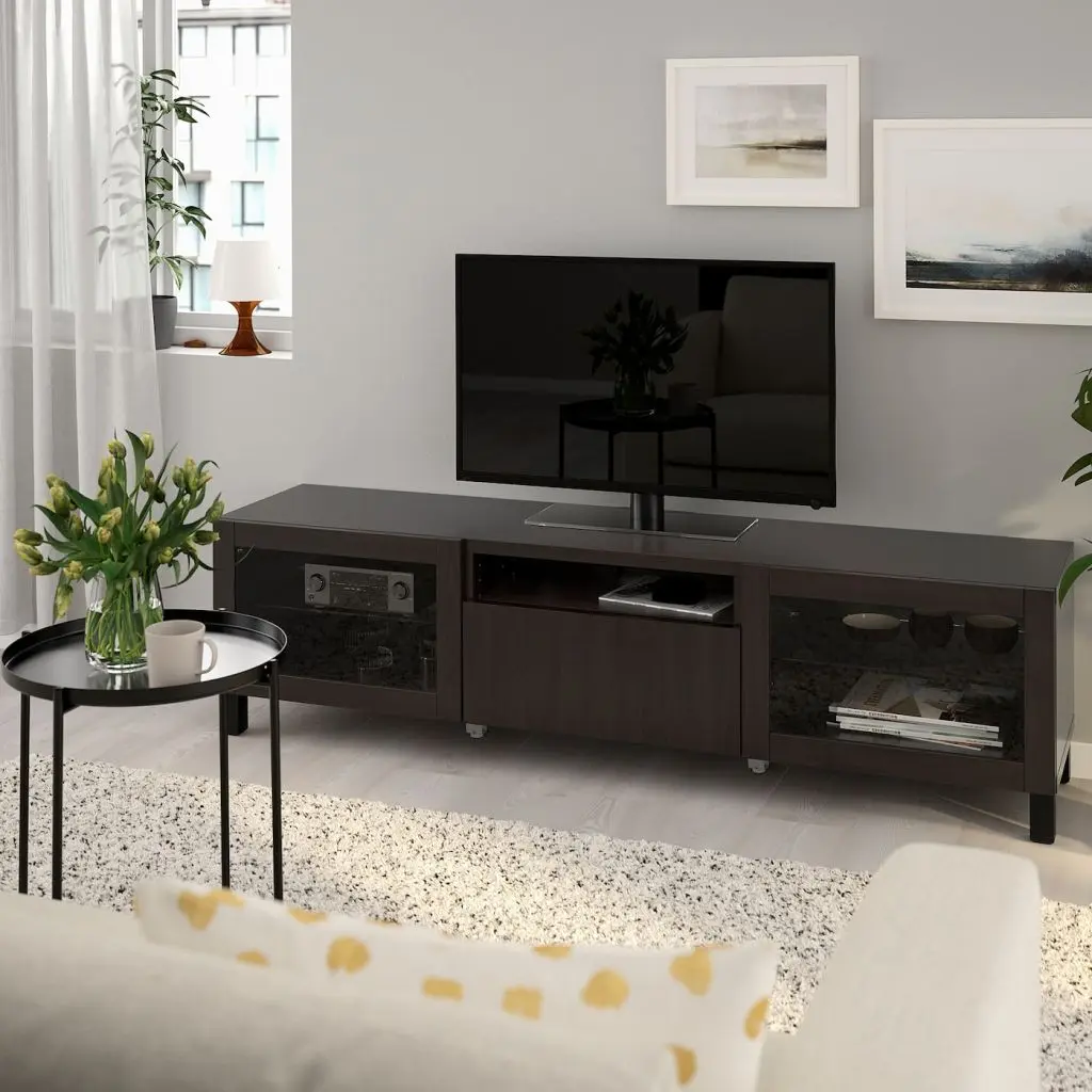 Благодаря функции плавного закрывания ящик закрывается мягко и бесшумно.Пульт дистанционного управления работает через стекло.Благодаря нескольким отверстиям на задней панели тумбы под ТВ провода от телевизора и других устройств всегда будут под рукой, но не на виду.Ножки придают комбинации БЕСТО более легкий вид, поднимая модули на полом. Кроме того, это упрощает уборку.Специальное отверстие в верхней панели обеспечит удобное и компактное размещение проводов.Эту мебель необходимо крепить к стене с помощью прилагаемого стенного крепежа.Макс. нагрузка на верхнюю панель этой тумбы под ТВ: 50 кг.Будьте осторожны при обращении с закаленным стеклом! Из-за поврежденных краев и царапин на поверхности стекло может внезапно разбиться.Для разных стен требуются различные крепежные приспособления. Подберите подходящие для ваших стен шурупы, дюбели, саморезы и т. п. (не прилагаются).Внутренние элементы для организации хранения в модулях БЕСТО продаются отдельно.Если вы выберете функцию плавного закрывания, рекомендуем дополнить фасады ручками, чтобы открывать ящики/шкафы было удобнее.Дизайнер
