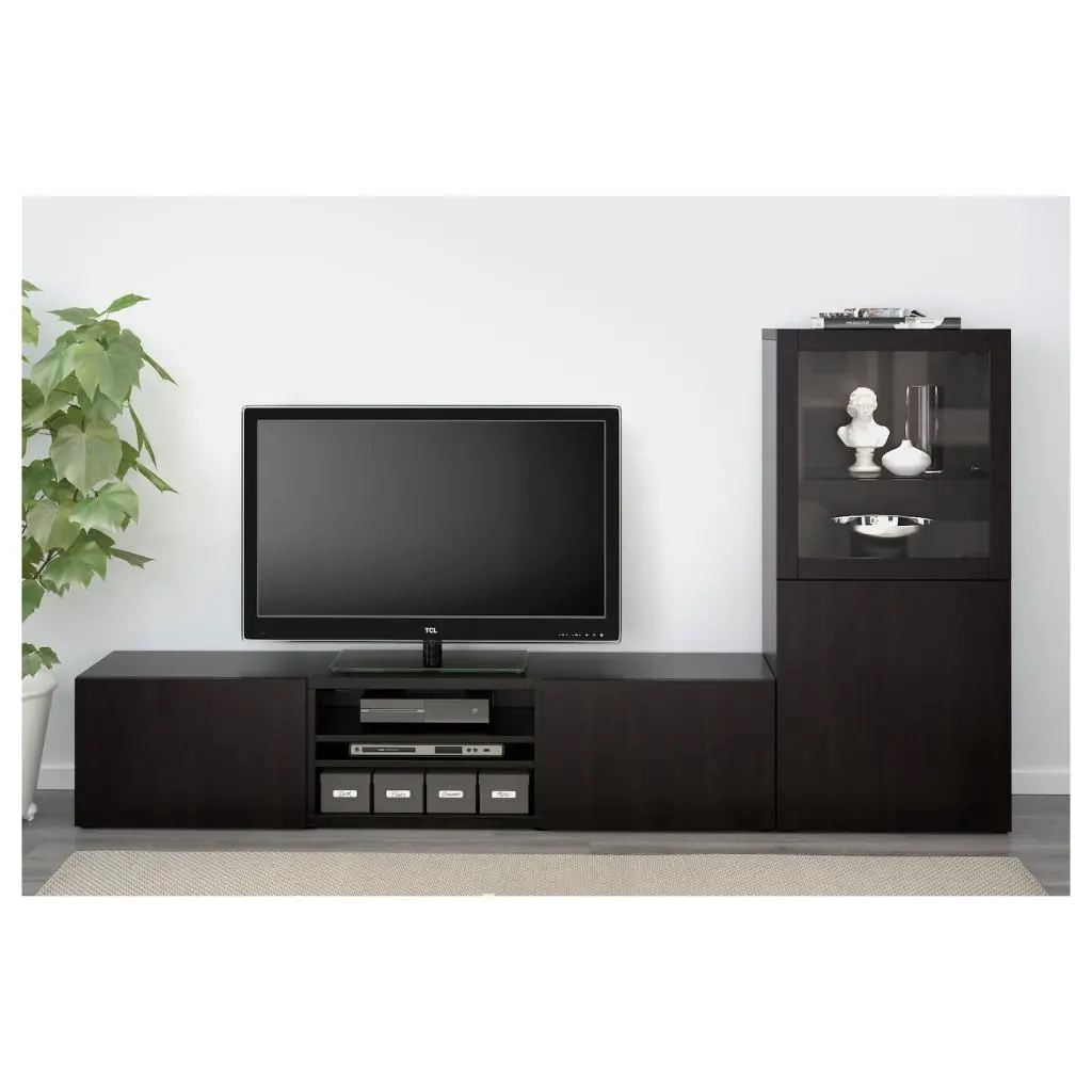Благодаря доводчикам ящики закрываются плавно и бесшумно.Благодаря нескольким отверстиям на задней панели тумбы под ТВ провода от телевизора и других устройств всегда будут под рукой, но не на виду.Два ящика и полки за дверцами обеспечат достаточно места для хранения.Съемные полки позволяют регулировать пространство.Специальное отверстие в верхней панели обеспечит удобное и компактное размещение проводов.Эту мебель необходимо крепить к стене с помощью прилагаемого стенного крепежа.Будьте осторожны при обращении с закаленным стеклом! Из-за поврежденных краев и царапин на поверхности стекло может внезапно разбиться.Макс. нагрузка на верхнюю панель этой тумбы под ТВ: 50 кг.Для разных стен требуются различные крепежные приспособления. Подберите подходящие для ваших стен шурупы, дюбели, саморезы и т. п. (не прилагаются).Максимальная нагрузка на закрепленный на стене модуль зависит от материала стены.Внутренние элементы для организации хранения в модулях БЕСТО продаются отдельно.Если вы выберете функцию плавного закрывания, рекомендуем дополнить фасады ручками, чтобы открывать ящики/шкафы было удобнее.Дизайнер