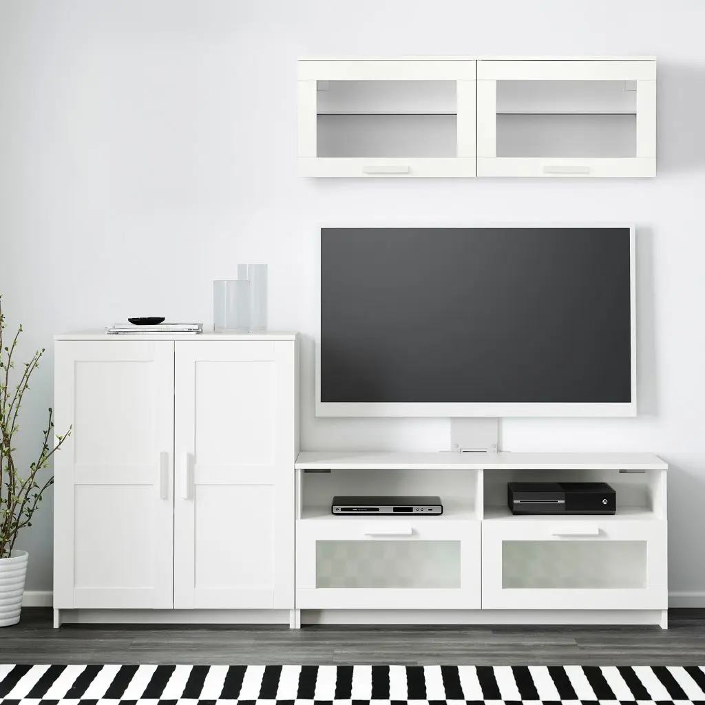 Эта комбинация для ТВ предоставит достаточно места для хранения, чтоб в вашей гостиной царил идеальный порядок.Глухие дверцы защитят содержимое от пыли.Отверстия для проводов на задней панели. Провода не на виду, но всегда под рукой.Ящики с плавным ходом и стопором.Эту мебель необходимо крепить к стене с помощью прилагаемого стенного крепежа.Для разных стен требуются различные крепежные приспособления. Подберите подходящие для ваших стен шурупы, дюбели, саморезы и т. п. (не прилагаются).Комбинируется с другой мебелью серии БРИМНЭС.Дизайнер