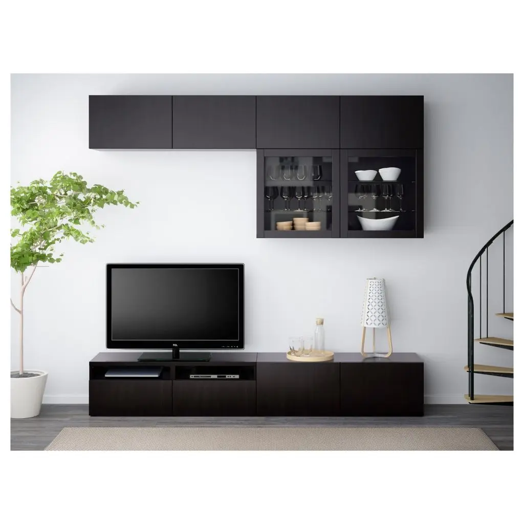 Благодаря нескольким отверстиям на задней панели тумбы под ТВ провода от телевизора и других устройств всегда будут под рукой, но не на виду.Специальное отверстие в верхней панели обеспечит удобное и компактное размещение проводов.Благодаря интегрированному нажимному механизму ящики и дверцы открываются легким нажатием.Ящики со встроенным нажимным механизмом открываются легким нажатием.Настенные шкафчики позволяют эффективно использовать пространство над телевизором.Ящики обеспечат более упорядоченное хранение ваших вещей. А полки за дверцами предоставят еще больше места.Съемные полки позволяют регулировать пространство.Организуйте и оптимизируйте систему для хранения БЕСТО, используя подходящие коробки и вставки.Эту мебель необходимо крепить к стене с помощью прилагаемого стенного крепежа.Максимальная нагрузка на закрепленный на стене каркас зависит от материала стены.Для разных стен требуются различные крепежные приспособления. Подберите подходящие для ваших стен шурупы, дюбели, саморезы и т. п. (не прилагаются).Для функционирования нажимного механизма необходимо пространство между каркасом и фронтальной панелью ящика, чтобы ящик открывался нажатием. Небольшой зазор необходим для обеспечения этой функции и не является недостатком товара.