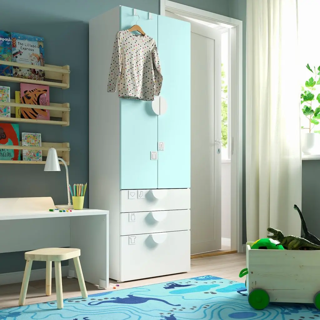С этим гардеробом у вас будет достаточно места для хранения даже в очень маленьком помещении.Неглубокий каркас — идеальное решение для небольших помещений.Для безопасности как детей, так и взрослых все дверцы системы СМОСТАД имеют скругленные углы.Двери с петлями для плавного закрывания всегда закрываются бесшумно — даже в разгар жаркого спора.Продуманная конструкция направляющих обеспечивает небольшой обратный ход при открывании, благодаря чему ящик закрывается плотно и без усилий.Удобные крючки на платяной штанге повышают шансы одежды, рюкзака и аксессуаров на возвращение в шкаф вместо того, чтобы оказаться на полу.Обустроить внутреннее пространство шкафа помогут элементы серии ХЭЛПА, а организовать порядок за его пределами позволят аксессуары серии ЛЭТТХЕТ.Проволочная корзина обеспечивает циркуляцию воздуха, благодаря чему одежда и белье дольше сохранят свежесть.Регулируемые ножки позволяют скорректировать неровности пола.