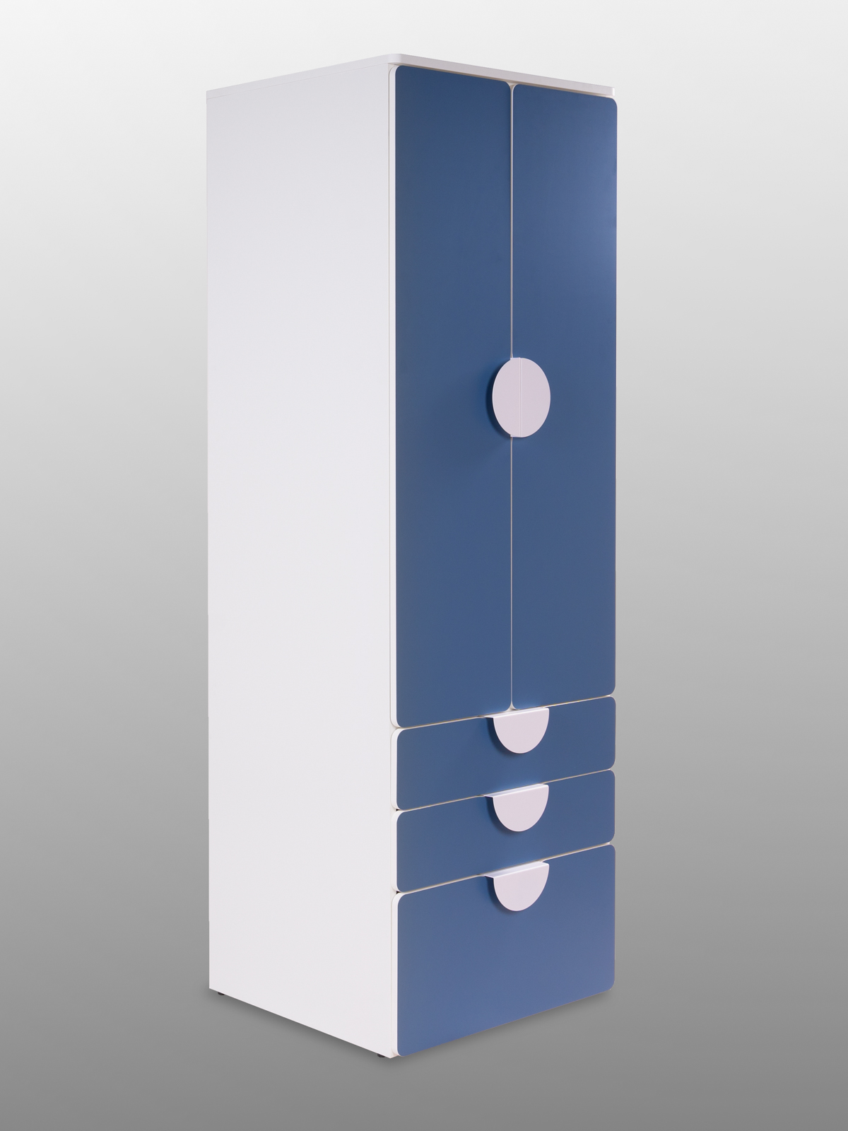 Шкаф витрина с полупрозрачным рефленым стеклом МОРУ и тремя выдвижными ящиками САГА, узкая 50 см. Бесшумные дверные петли с замедлителем. Ящики установлены на направляющих с доводчиками скрытого монтажа