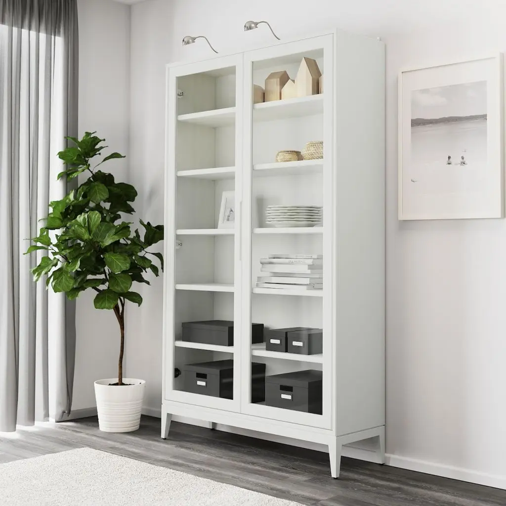 Благодаря продуманным деталям создается ощущение, что эта мебель изготовлена вручную искусным мастером.Съемные полки позволяют регулировать внутреннее пространство в соответствии с потребностями хранения.1 несъемная полка для большей устойчивости.Регулируемые ножки; обеспечивают устойчивость даже на неровном полу.Сборка очень проста благодаря штифтам, которые вставляются в подготовленные отверстия.Будьте осторожны при обращении со стеклом! Из-за поврежденных краев и царапин на поверхности стекло может внезапно треснуть и/или разбиться. Избегайте ударов сбоку, там стекло наиболее уязвимо.Эту мебель необходимо крепить к стене с помощью прилагаемого стенного крепежа.Для разных стен требуются различные крепежные приспособления. Подберите подходящие для ваших стен шурупы, дюбели, саморезы и т. п. (не прилагаются).4 съемные полки и 1 несъемная полка прилагаются.Дизайнер