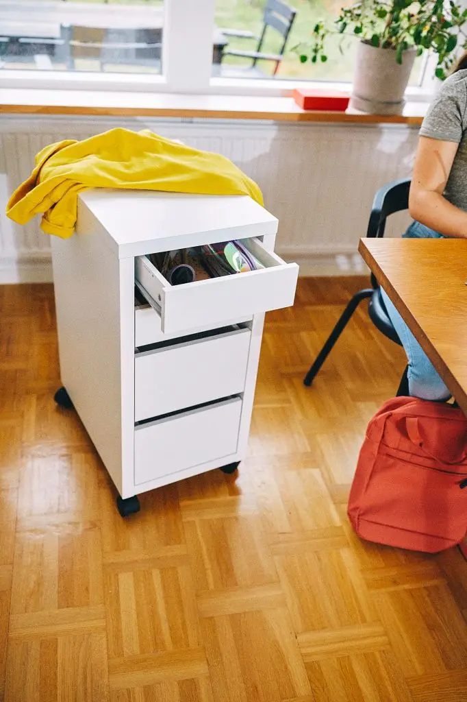 Благодаря стопорам ящик не выпадает из каркаса.Благодаря лицевой отделке задней панели модуль можно поставить в центр комнаты.Рабочее место можно увеличить, комбинируя столы и тумбы. В серии МИККЕ все столы и тумбы одинаковой высоты.Ящик подходит для хранения бумаги формата А4.Этот товар протестирован и одобрен для бытового использования.Дизайнер