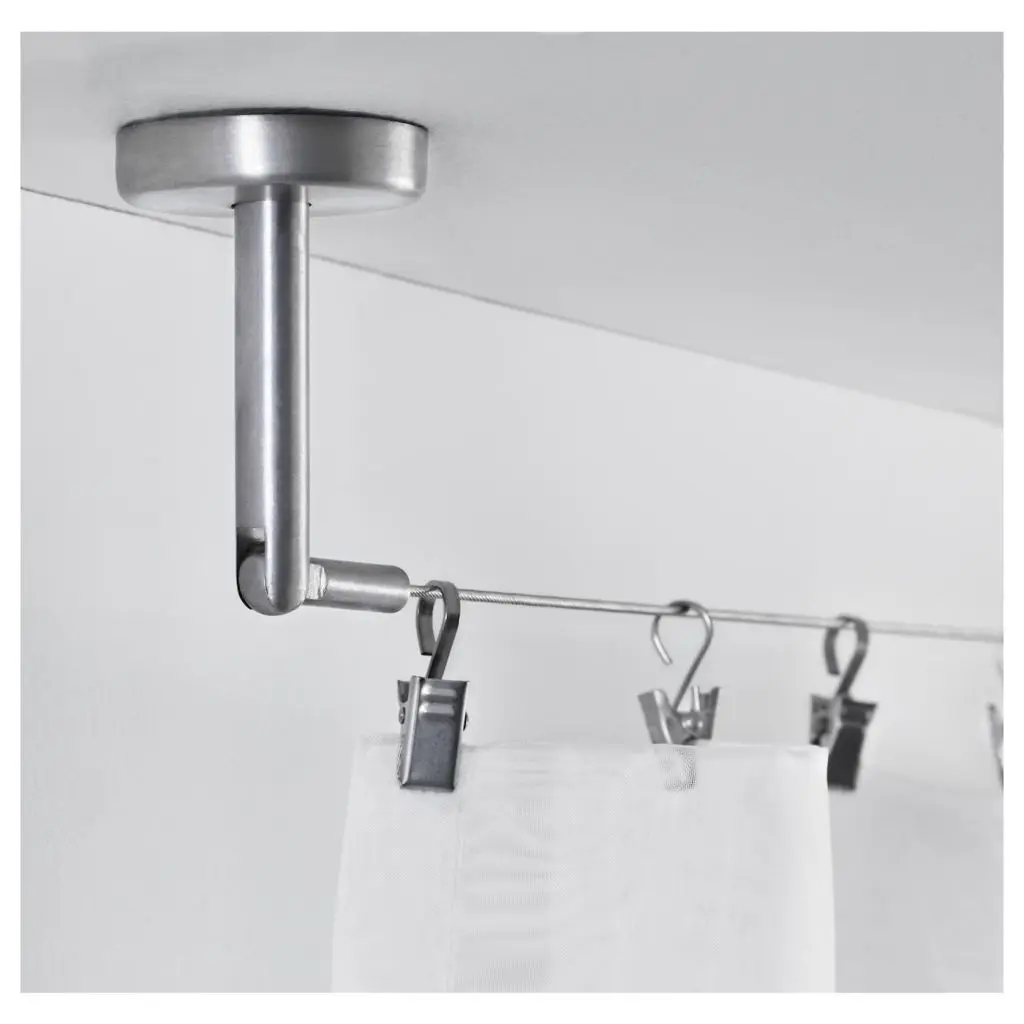 Полный набор с креплениями и гардинной струной; можно закрепить на стене или потолке.Крепления с регулируемым углом; расширяют возможности использования.Можно легко отрезать до нужной длины.Также можно использовать в ванной.В набор входит: 1 гардинная струна и 2 настенных крепления.Для гардинной струны длиннее 140 см необходимы дополнительные крепления: до 280 см – 1 дополнительное крепление, до 420 см – 2 дополнительных крепления, до 500 см – 3 дополнительных крепления.Для разных материалов стен и потолков необходимы различные крепления. Используйте крепления (не прилагаются), которые подходят для стен и потолков в Вашем доме.Дизайнер
