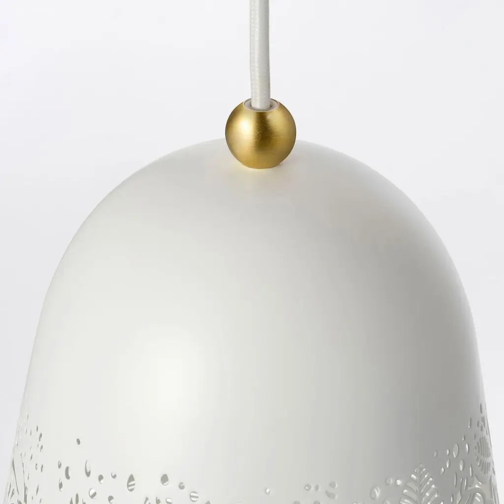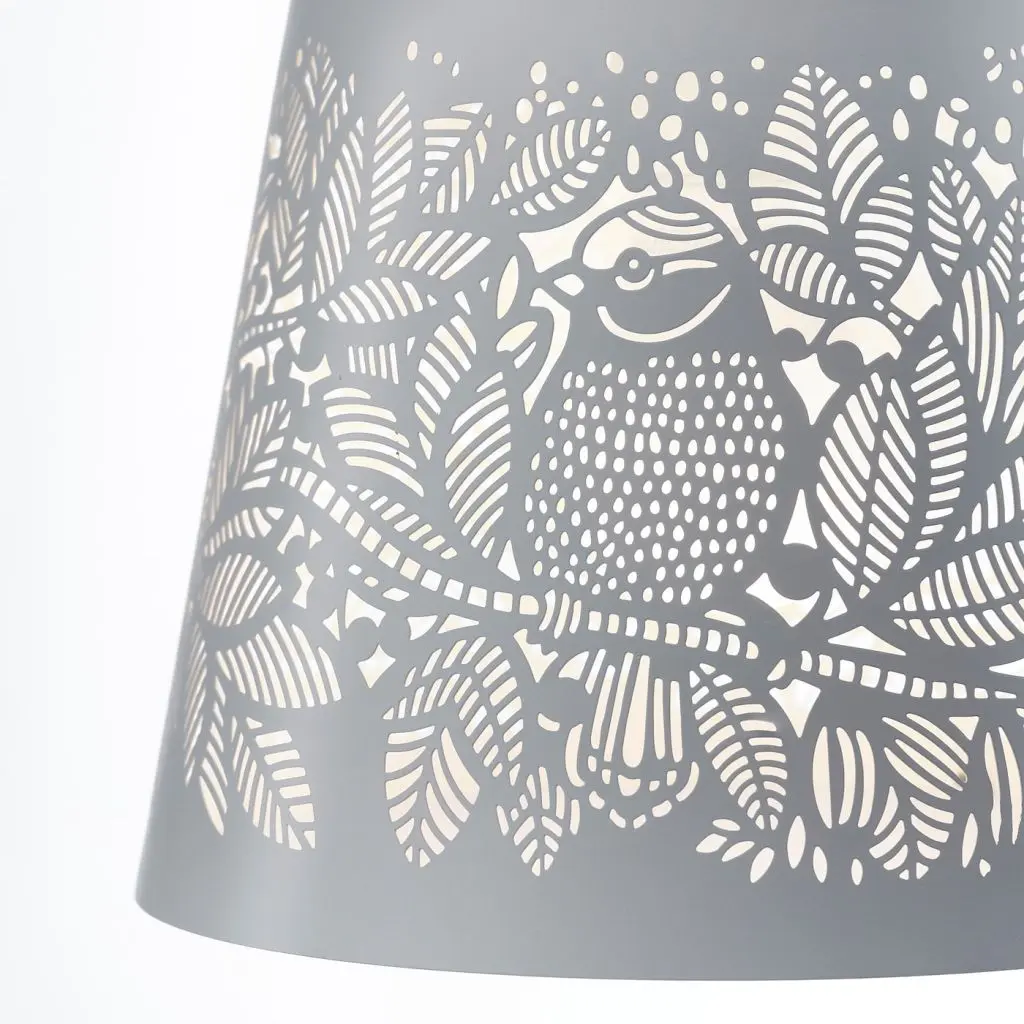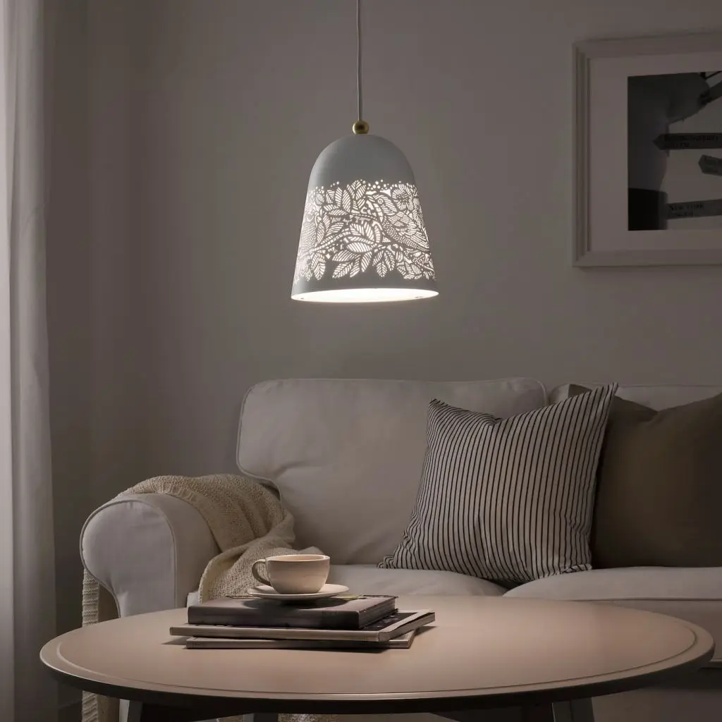 Подвесной светильник СОЛЬСКУР с нежным перфорированным орнаментом с изображениями птиц и растений — просто идеальное решение для создания романтической атмосферы. Светильник обеспечивает мягкое освещение для настроения.