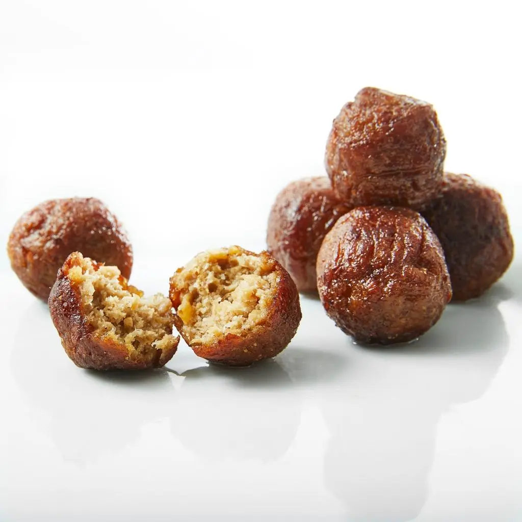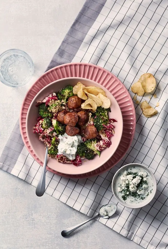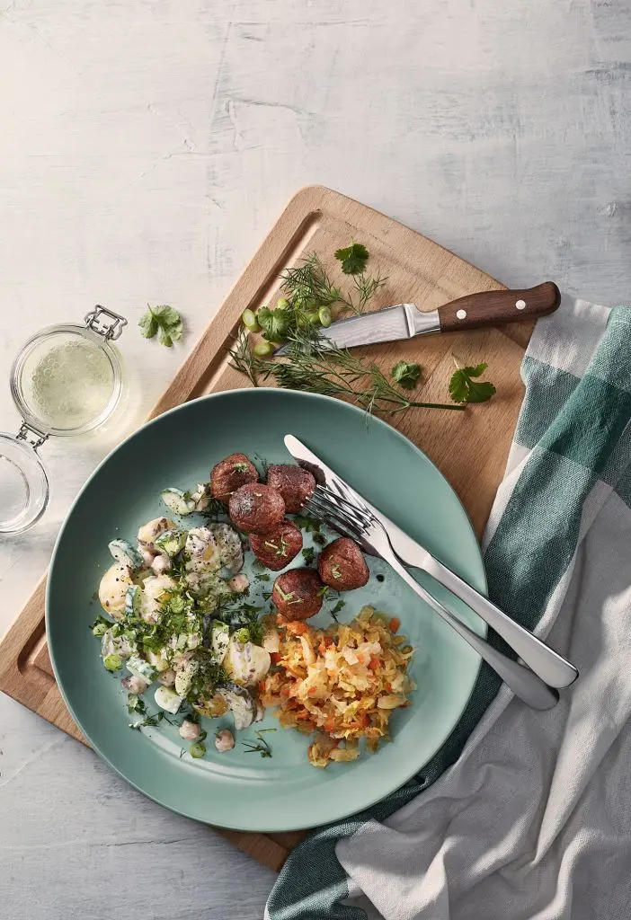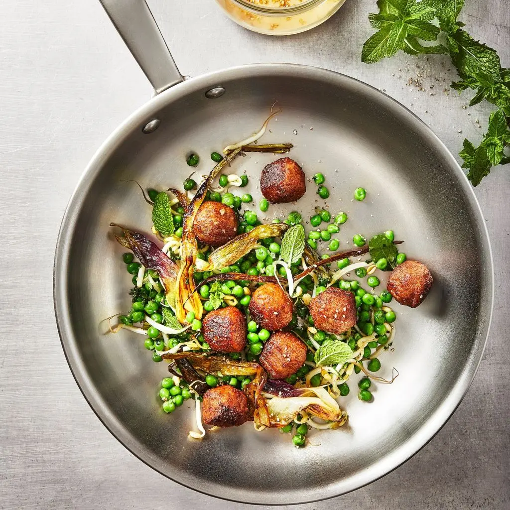 Наши фрикадельки из горохового белка, овса, картофеля, яблок и лука по вкусу и сочности почти неотличимы от мясных. А их углеродный след составляет всего 4 % от аналогичного показателя традиционных. Блюдо для мясоедов, которые заботятся об экологии.