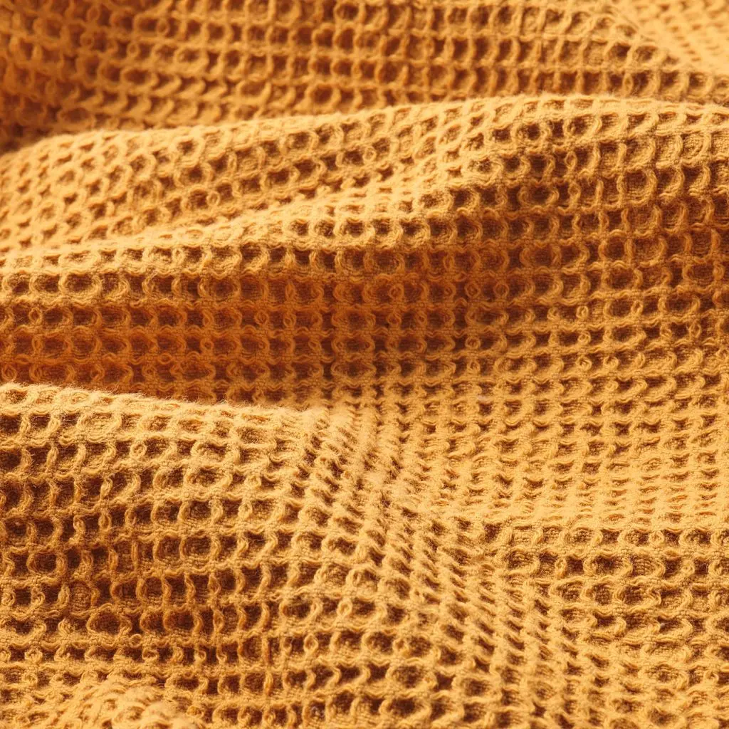 Темно-желтое вафельное полотенце из хлопка и вискозы хорошо впитывает влагу и быстро сохнет. Бахрома по краю придает ему интересную изюминку. Отлично сочетается по стилю и цвету с полотенцами ВИНАРН.
