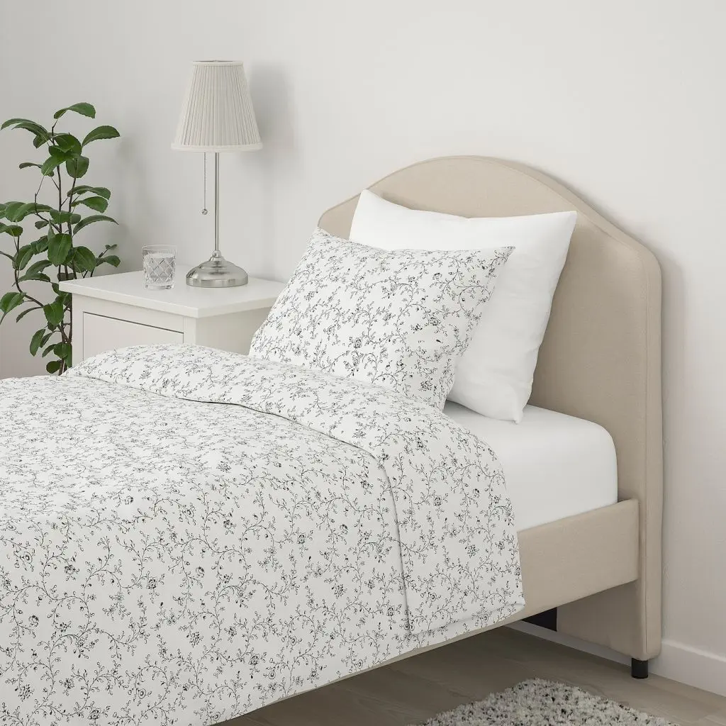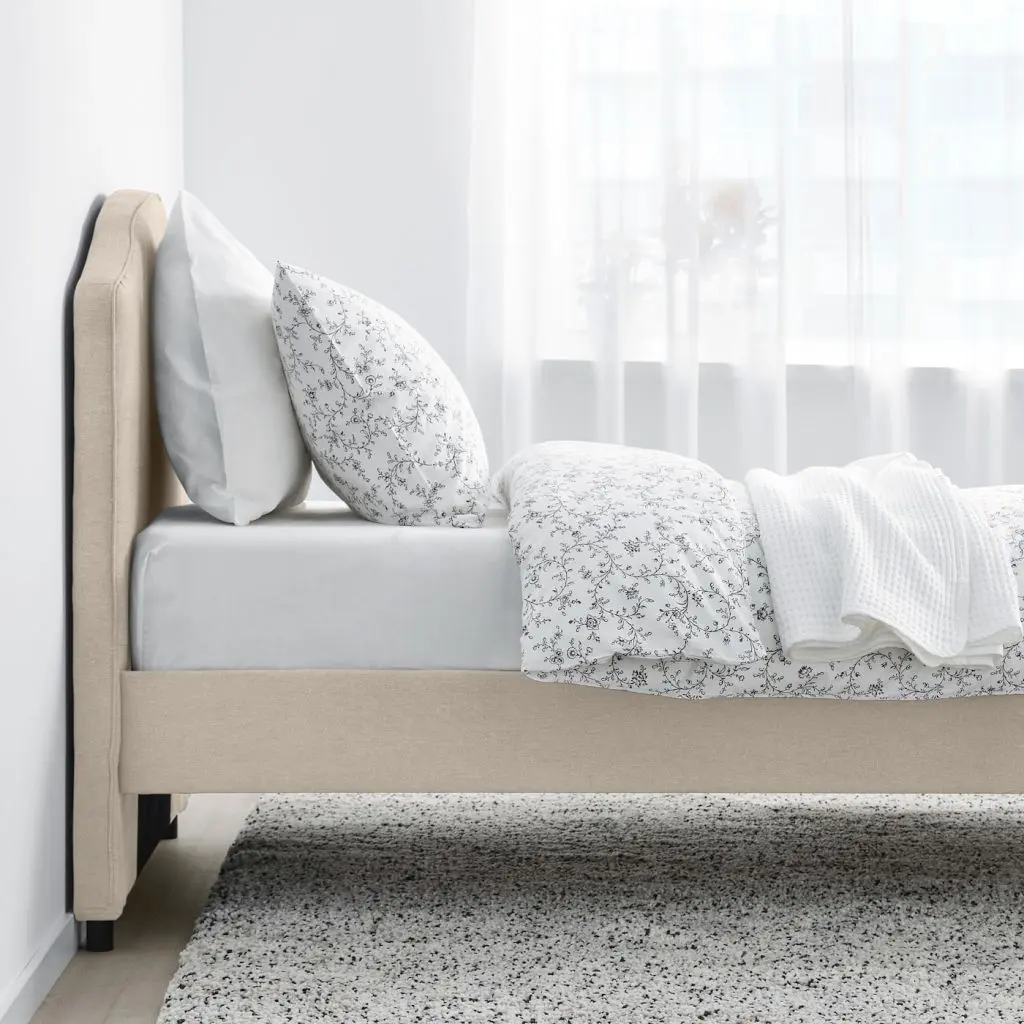Классический дизайн, мягкая обивка, плавные линии и окантовка по краю изголовья и изножья.На мягкое изголовье можно с комфортом опереться, когда вы смотрите телевизор или читаете в постели.Под кроватью можно разместить ящики — отличное решение для хранения подушек и одеял.Пространство под кроватью можно без труда почистить пылесосом.Обивка изготовлена из бежевой полиэстерной ткани Лофаллет — прочной и приятной на ощупь.Матрас и постельное белье продаются отдельно.Задняя сторона изголовья отделана тканью черного цвета.Реечное дно кровати прилагается.Износостойкость чехла подтверждена 25000 циклов воздействия истиранием. Способность выдержать 15000 циклов и более считается нормой для мебели для бытового использования.Чехол имеет уровень светостойкости (способность противостоять выцветанию) 5 по шкале от 1 до 8. В соответствии с отраслевыми стандартами материал с уровнем светостойкости 4 или выше подходит для домашнего использования.