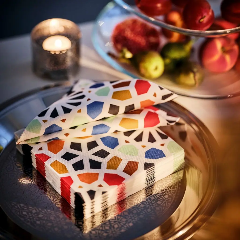 Яркий многоцветный геометрический орнамент вдохновлен современной марокканской плиткой. С салфетками из коллекции ХЕМБЬЮДЕН за вашим столом всегда будет царить солнечная атмосфера — независимо от погоды за окном.