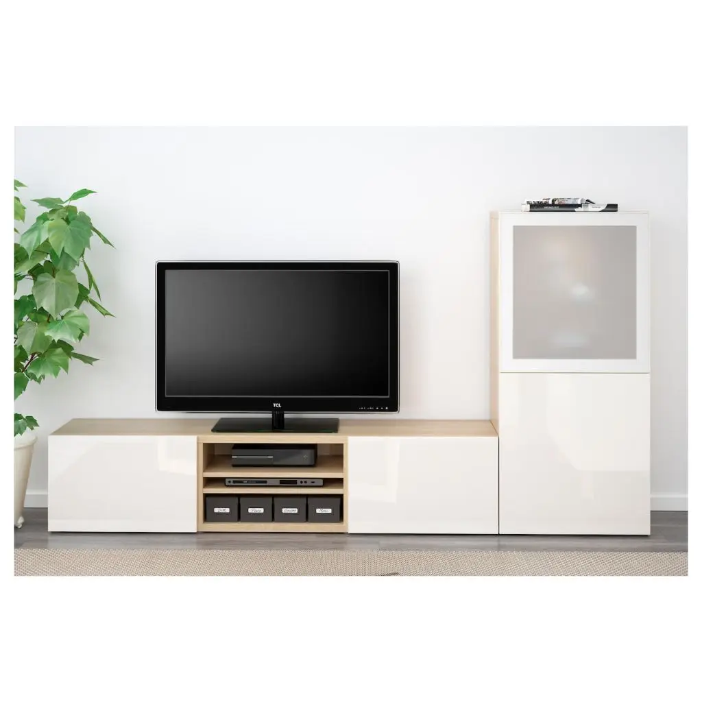 Благодаря доводчикам ящики закрываются плавно и бесшумно.Благодаря нескольким отверстиям на задней панели тумбы под ТВ провода от телевизора и других устройств всегда будут под рукой, но не на виду.Два ящика и полки за дверцами обеспечат достаточно места для хранения.Съемные полки позволяют регулировать пространство.Специальное отверстие в верхней панели обеспечит удобное и компактное размещение проводов.Эту мебель необходимо крепить к стене с помощью прилагаемого стенного крепежа.Будьте осторожны при обращении с закаленным стеклом! Из-за поврежденных краев и царапин на поверхности стекло может внезапно разбиться.Макс. нагрузка на верхнюю панель этой тумбы под ТВ: 50 кг.Для разных стен требуются различные крепежные приспособления. Подберите подходящие для ваших стен шурупы, дюбели, саморезы и т. п. (не прилагаются).Максимальная нагрузка на закрепленный на стене модуль зависит от материала стены.Внутренние элементы для организации хранения в модулях БЕСТО продаются отдельно.Если вы выберете функцию плавного закрывания, рекомендуем дополнить фасады ручками, чтобы открывать ящики/шкафы было удобнее.Дизайнер