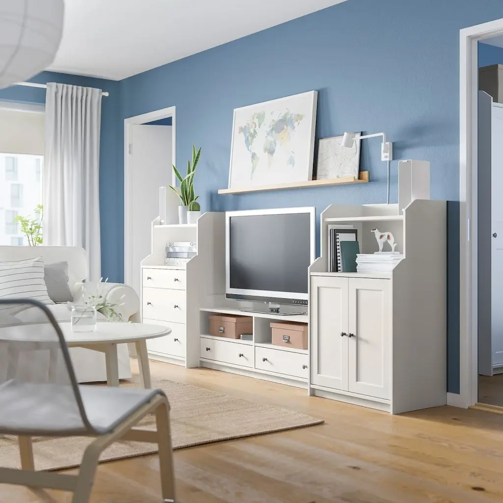Ваш дом должен быть абсолютно безопасен для всей семьи. Именно поэтому крепеж безопасности для фиксации мебели к стене прилагается.Регулируемые петли позволяют отрегулировать дверь по горизонтали, вертикали и по глубине.Комбинируйте открытое и закрытое хранение в зависимости от потребностей.Отверстия в задней панели тумбы под ТВ позволяет организовать провода.ВНИМАНИЕ! ОПАСНОСТЬ ОПРОКИДЫВАНИЯ! Незакрепленная мебель может опрокинуться. Эту мебель необходимо крепить к стене с помощью прилагаемого крепежа для предотвращения опрокидывания.Максимальная нагрузка на верхнюю панель этой тумбы под ТВ составляет 20 кг, поэтому на ней нельзя сидеть.2 регулируемые по высоте полки прилагаются.Для различных материалов стен требуются различные крепежные средства. Используйте крепежные средства, подходящие для материала стен в вашем доме.В ящик можно положить примерно 12 пар брюк или 20 футболок.