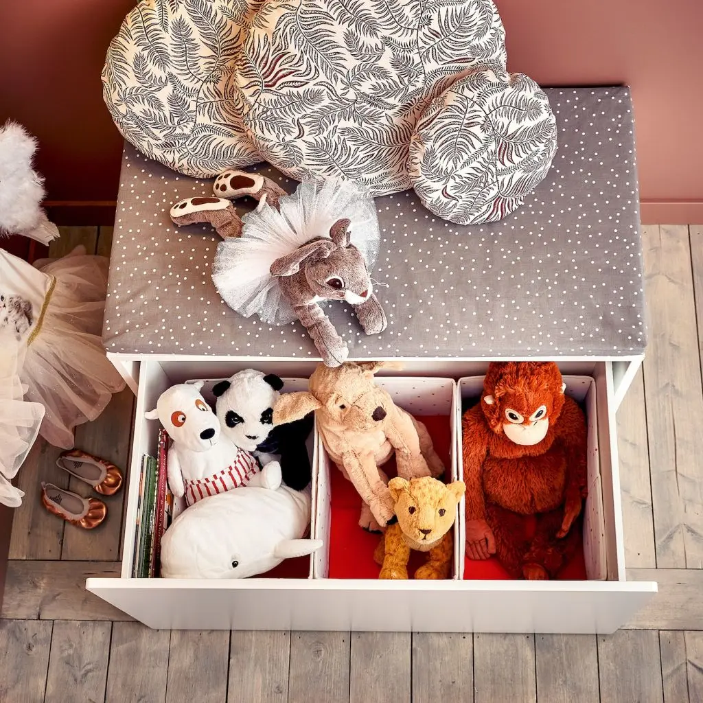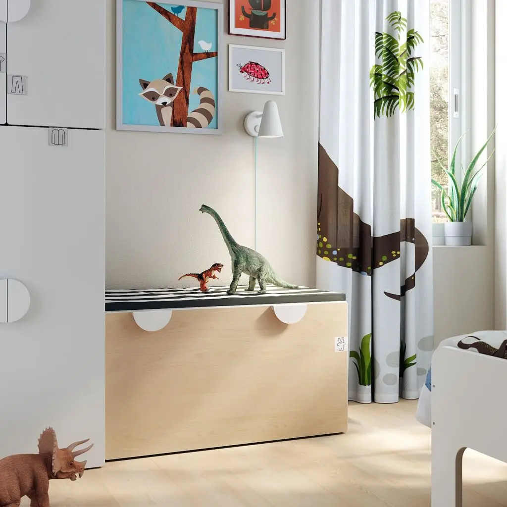 Достаточно места для больших мягких игрушек и мячей. Практичное решение, чтобы быстро убрать игрушки.Регулируемые ножки прилагаются, обеспечивают устойчивость даже на неровном полу.Колеса прилагаются.Дополните подушкой на скамью БЭНККАМРАТ, чтобы сидеть было мягче и комфортнее.Ручки продаются отдельно.