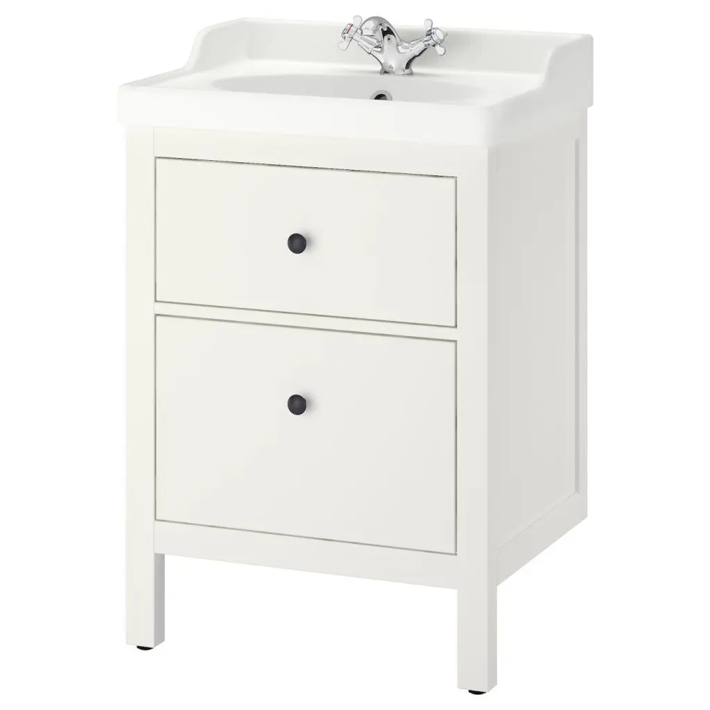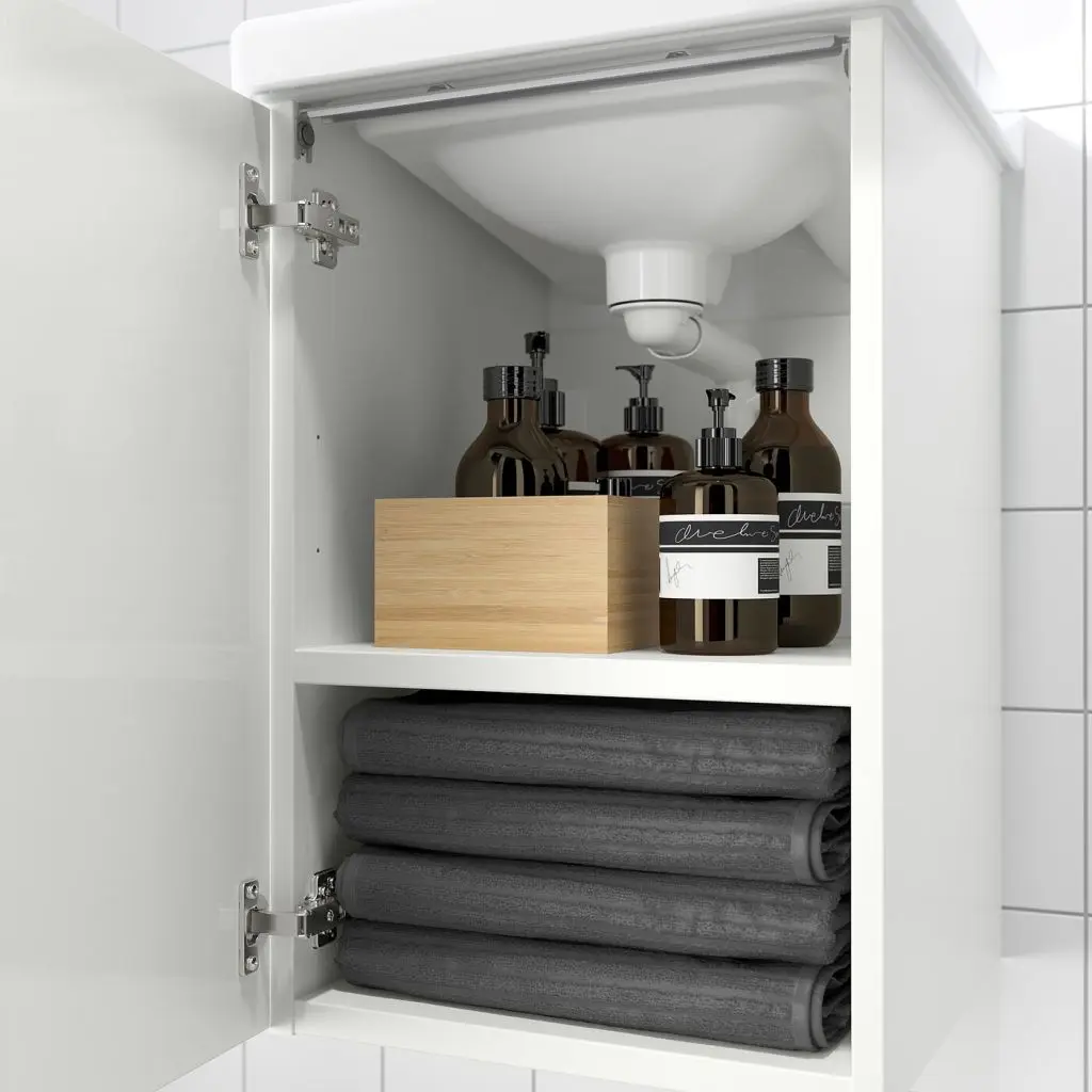 Серия ФИСКОН позволяет с легкостью создавать комбинации мебели, чтобы обновить интерьер ванной. В этом напольном шкафу под раковину с полкой поместятся полотенца и туалетная бумага, а белые лаконичные дверцы сделают решение ярче.
