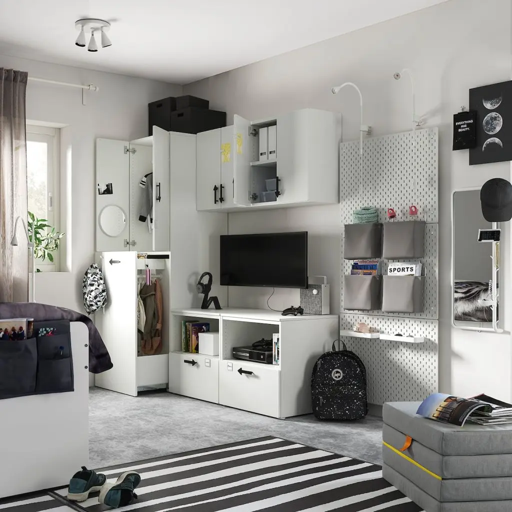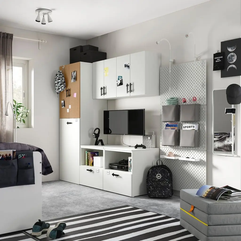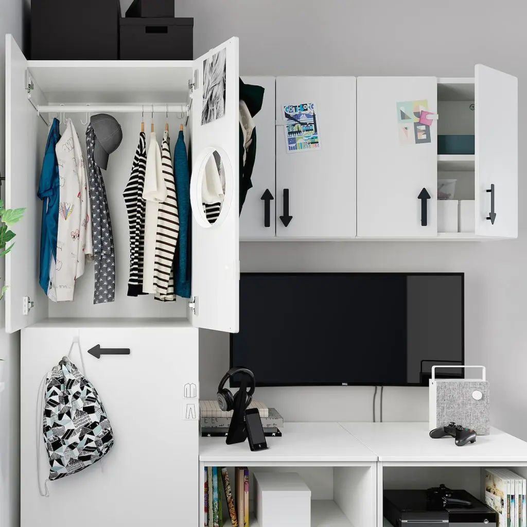 Такое решение дает вам много места для хранения и освобождает пространство для экрана или доски для записей на стене.Ваш ребенок сможет много лет пользоваться этим решением для хранения, так как по мере изменения потребностей вы можете менять внутреннее оснащение.В нижней части выдвижного модуля можно хранить все, что нужно быстро убирать с глаз долой.Ваш ребенок может повесить свои любимые рисунки и важные заметки на пробковые дверцы, и не придется сверлить лишние отверстия в стене.Благодаря крючкам изнутри и снаружи ребенку будет гораздо проще развешивать одежду, рюкзаки и другие вещи, которые обычно просто валяются на полу.Двери с петлями для плавного закрывания всегда закрываются бесшумно — даже в разгар жаркого спора.ВНИМАНИЕ! ОПАСНОСТЬ ОПРОКИДЫВАНИЯ! Незакрепленная мебель может опрокинуться. Эту мебель необходимо крепить к стене с помощью прилагаемого крепежа для предотвращения опрокидывания.Рекомендовано для детей от 6 лет.Для разных стен требуются различные крепежные приспособления. Подберите подходящие для ваших стен шурупы, дюбели, саморезы и т. п. (не прилагаются).Можно дополнить ручками.Ручки продаются отдельно.