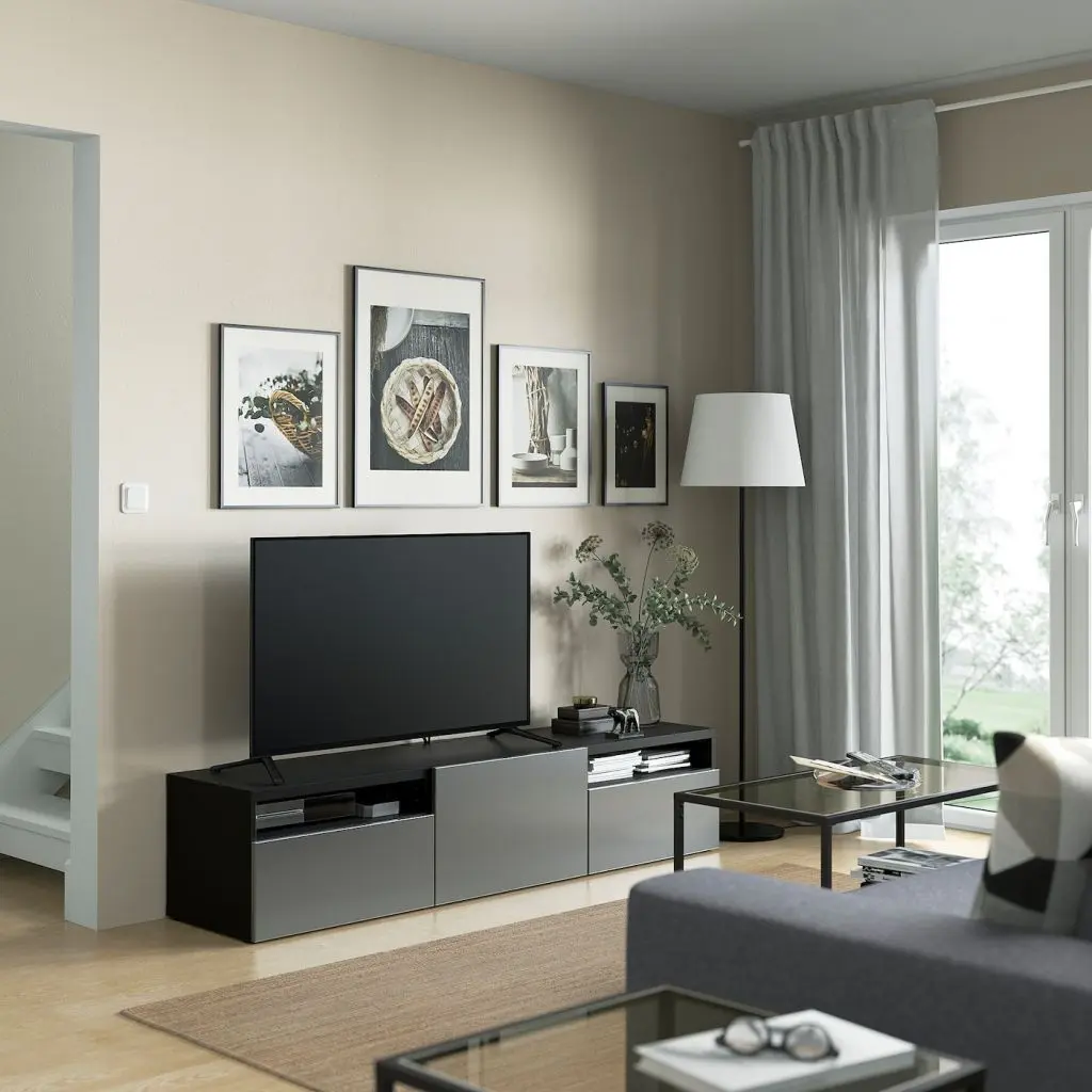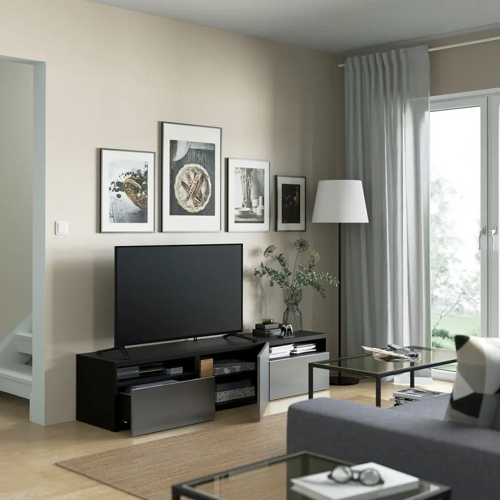 Благодаря доводчикам ящики закрываются плавно и бесшумно.Благодаря нескольким отверстиям на задней панели тумбы под ТВ провода от телевизора и других устройств всегда будут под рукой, но не на виду.Два ящика обеспечат порядок в хранении пультов, игровых приставок и других аксессуаров для ТВ.Регулируемые ножки обеспечивают устойчивость тумбы под ТВ даже на неровном полу.Организуйте и оптимизируйте систему для хранения БЕСТО, используя подходящие коробки и вставки.Тумбу под ТВ необходимо крепить к стене с помощью прилагающегося стенного крепежа.Если вы выберете функцию плавного закрывания, рекомендуем дополнить фасады ручками, чтобы открывать ящики/шкафы было удобнее.Максимальная нагрузка на закрепленный на стене модуль зависит от материала стены.Для разных стен требуются различные крепежные приспособления. Подберите подходящие для ваших стен шурупы, дюбели, саморезы и т. п. (не прилагаются).
