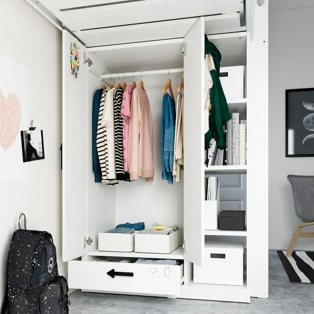 По мере взросления ребенок все острее нуждается в личном пространстве. Эта комбинация просто создана для обустройства небольших пространств или общих комнат для нескольких детей.В эту компактную комбинацию входит чердак-кровать, письменный стол с выдвижными ящиками, гардероб с выдвижным ящиком и книжная полка.Лестницу можно установить справа или слева.Письменный стол можно закрепить параллельно или перпендикулярно кровати. Гардероб также можно поворачивать в разные стороны.Двери, петли и платяная штанга прилагаются.Требуемая минимальная высота потолка для сборки в горизонтальном положении – 244 см, в вертикальном – 242 см.Сборку должны производить два человека.Для организации внутреннего пространства дополните аксессуарами ХЭНГИГ, полками и проволочными корзинами ХЭЛПА и коробками УППРЮМД. Продаются отдельно.Ручки продаются отдельно.Матрас продается отдельно.Не устанавливайте на кровати крючки и ручки и не привязывайте веревки или ремни, в которых дети могут запутаться. Это может стать причиной удушения.Высокие кровати, а также верхний ярус 2-ярусных кроватей и кроватей-чердаков не подходят для детей до 7 лет из-за опасности получения травм вследствие падения.