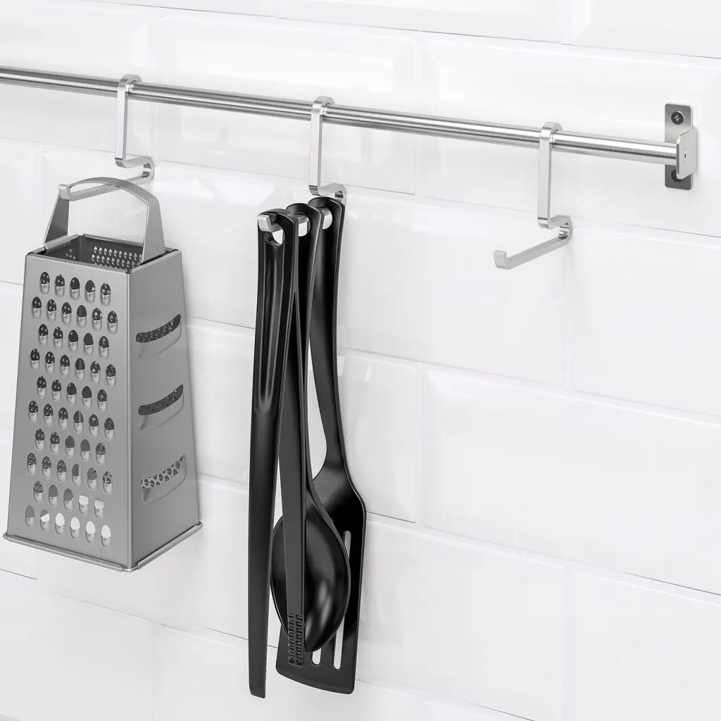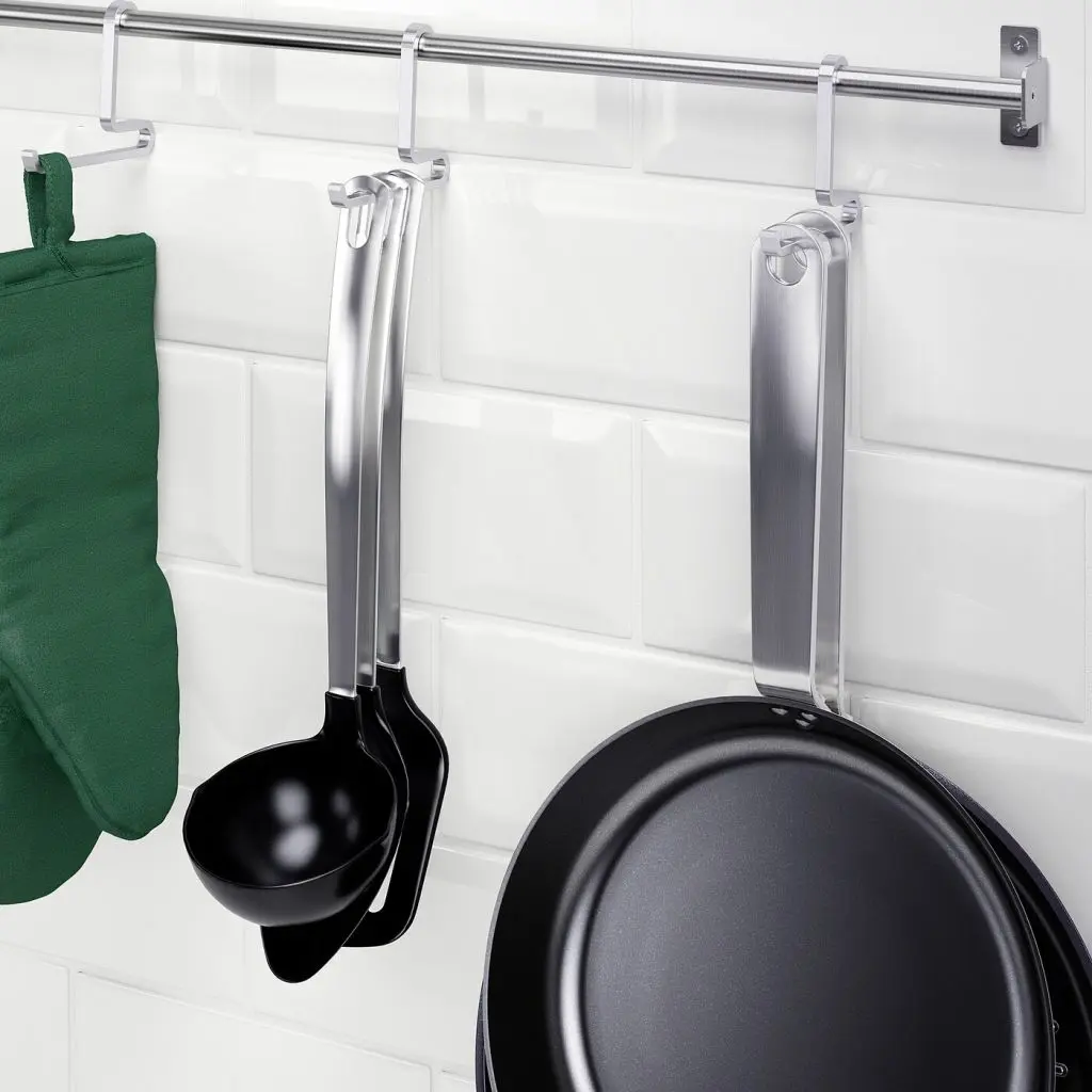 На один крючок можно повесить несколько кухонных принадлежностей, что позволит освободить место на столешнице.Используйте крючки для хранения кухонных принадлежностей на стене, а также в шкафах и ящиках.Также можно использовать в помещениях с высокой влажностью.Можно повесить на рейлинг КУНГСФОРС.Можно комбинировать с другими товарами серии КУНГСФОРС.Рекомендуется использовать только в помещении.Дизайнер