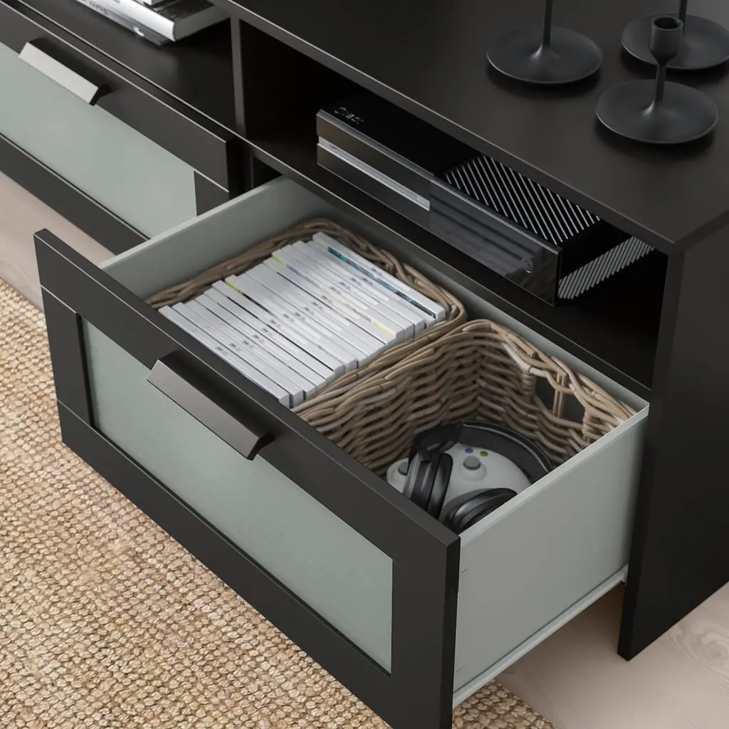 В больших ящиках этой тумбы удобно хранить пульты дистанционного управления, игровые приставки и другие ТВ-аксессуары.Отверстия для проводов на задней панели. Провода не на виду, но всегда под рукой.Будьте осторожны при обращении со стеклом! Из-за поврежденных краев и царапин на поверхности стекло может внезапно треснуть и/или разбиться. Избегайте ударов сбоку, там стекло наиболее уязвимо.Эту мебель необходимо крепить к стене с помощью прилагаемого стенного крепежа.Для разных стен требуются различные крепежные приспособления. Подберите подходящие для ваших стен шурупы, дюбели, саморезы и т. п. (не прилагаются).Комбинируется с другой мебелью серии БРИМНЭС.Дизайнер