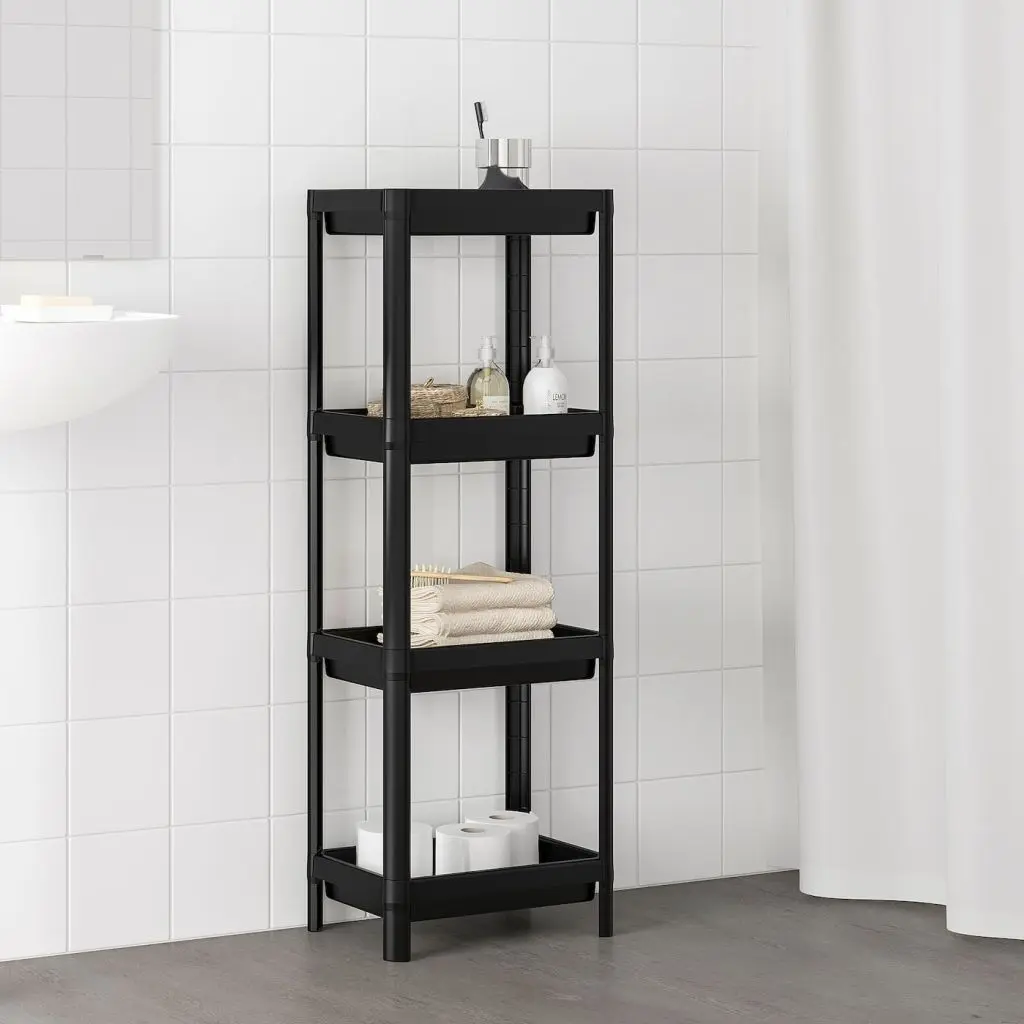 Стеллаж легко собрать без инструментов – детали просто соединяются до щелчка.Благодаря бортикам шампуни, гели для душа и т.п. не упадут с полочки.Отличное решение для небольшой ванной.Мебель необходимо крепить к стене с помощью прилагаемого крепежа безопасности. Это предотвратит опрокидывание мебели, если ребенок решит на нее забраться или повиснет на ней.Для разных стен требуются различные крепежные приспособления. Подберите подходящие для ваших стен шурупы, дюбели, саморезы и т. п. (не прилагаются).Дизайнер