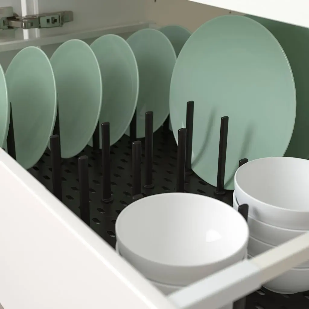 32 съемных колышка позволяют легко регулировать внутреннее пространство выдвижных ящиков в соответствии с хранящимися в них предметами — тарелками, кастрюлями, крышками или контейнерами для продуктов.Комбинируйте с другими органайзерами для ящика серии УППДАТЕРА.32 колышка прилагаются.Дизайнер