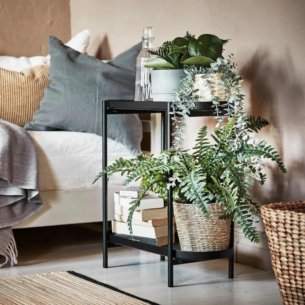 Поставьте любимые комнатные растения на уровне глаз — или расположите их на другой высоте. У этого пьедестала несколько полок, поэтому при желании вы можете менять экспозицию или даже использовать полки вместо столика, например для чашечки кофе и книжки.
