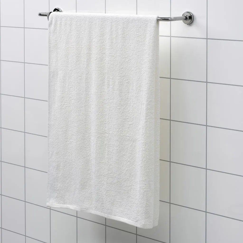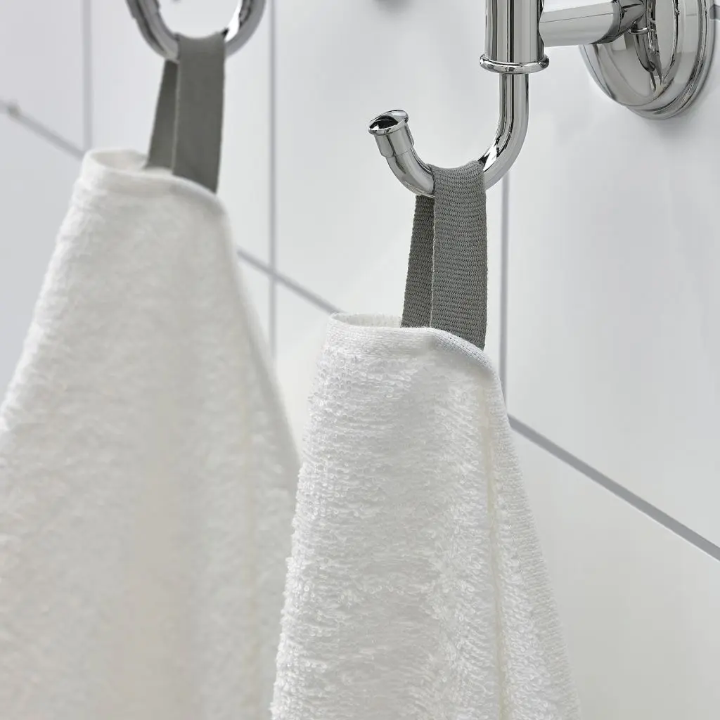 Мягкое белое полотенце с петелькой для подвешивания контрастного зеленого цвета — практичной и декоративной деталью. Легкая ткань из смеси хлопка и вискозы прекрасно впитывает влагу.