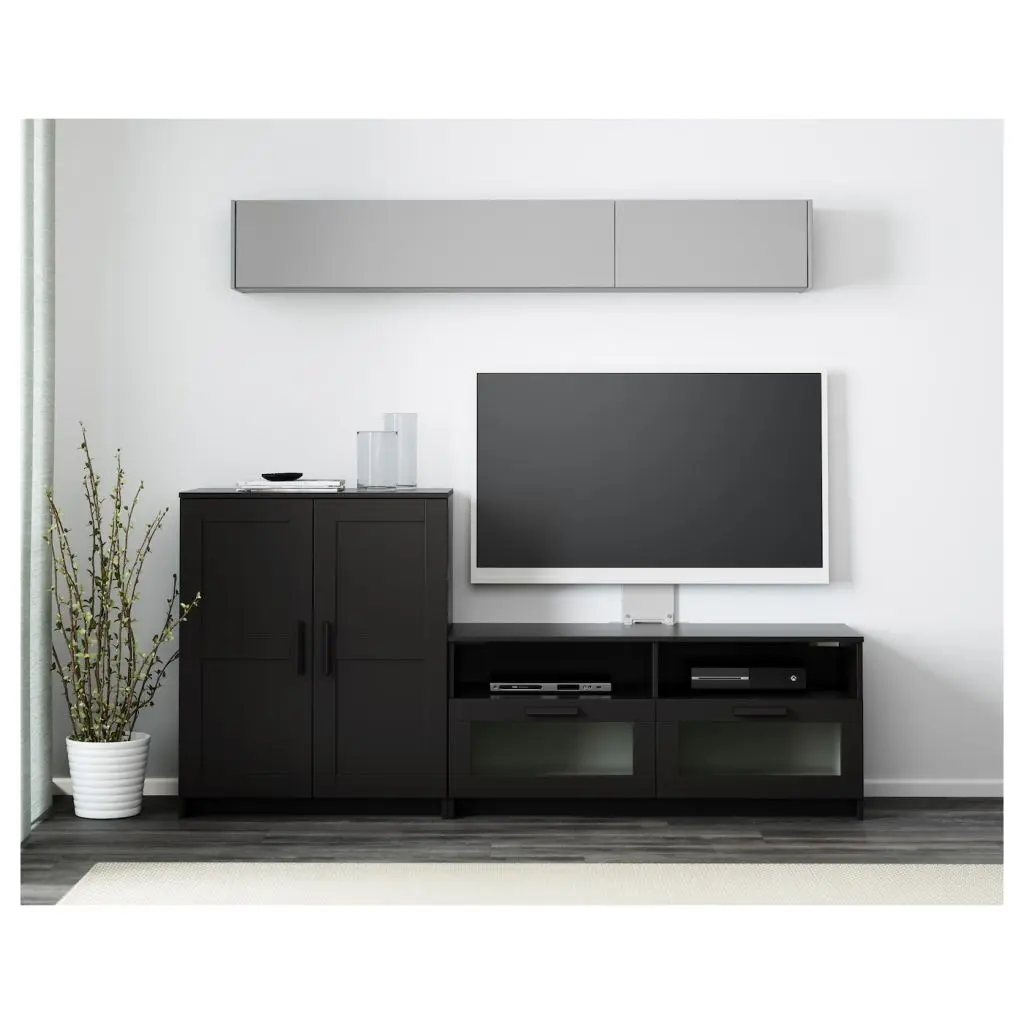В больших ящиках этой тумбы удобно хранить пульты дистанционного управления, игровые приставки и другие ТВ-аксессуары.Съемные полки позволяют регулировать внутреннее пространство в соответствии с потребностями хранения.Отверстия для проводов на задней панели. Провода не на виду, но всегда под рукой.Эту мебель необходимо крепить к стене с помощью прилагаемого стенного крепежа.Будьте осторожны при обращении со стеклом! Из-за поврежденных краев и царапин на поверхности стекло может внезапно треснуть и/или разбиться. Избегайте ударов сбоку, там стекло наиболее уязвимо.Для разных стен требуются различные крепежные приспособления. Подберите подходящие для ваших стен шурупы, дюбели, саморезы и т. п. (не прилагаются).Комбинируется с другой мебелью серии БРИМНЭС.Дизайнер