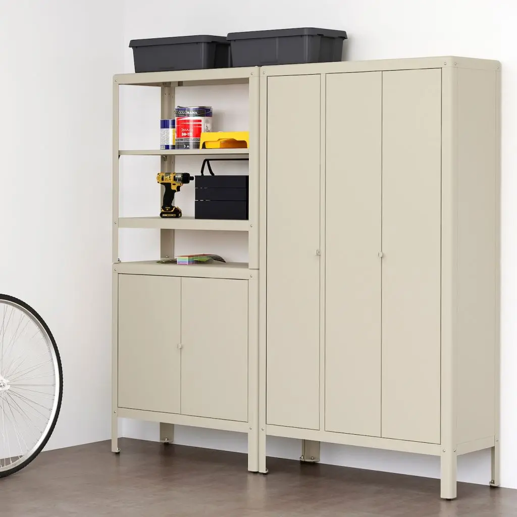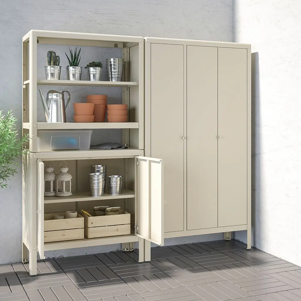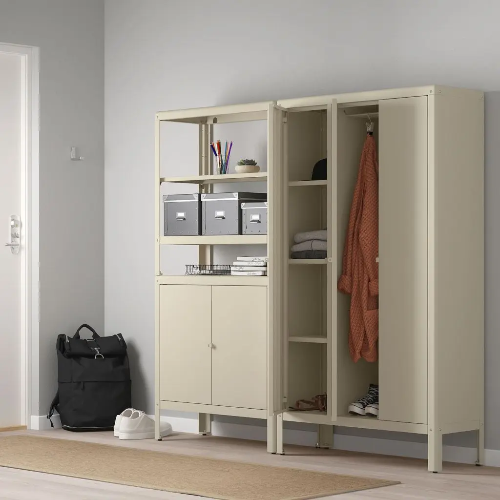 Стеллаж и шкаф изготовлены из стали с порошковым покрытием, что обеспечивает прочность, простоту в уходе и защиту от ржавчины.